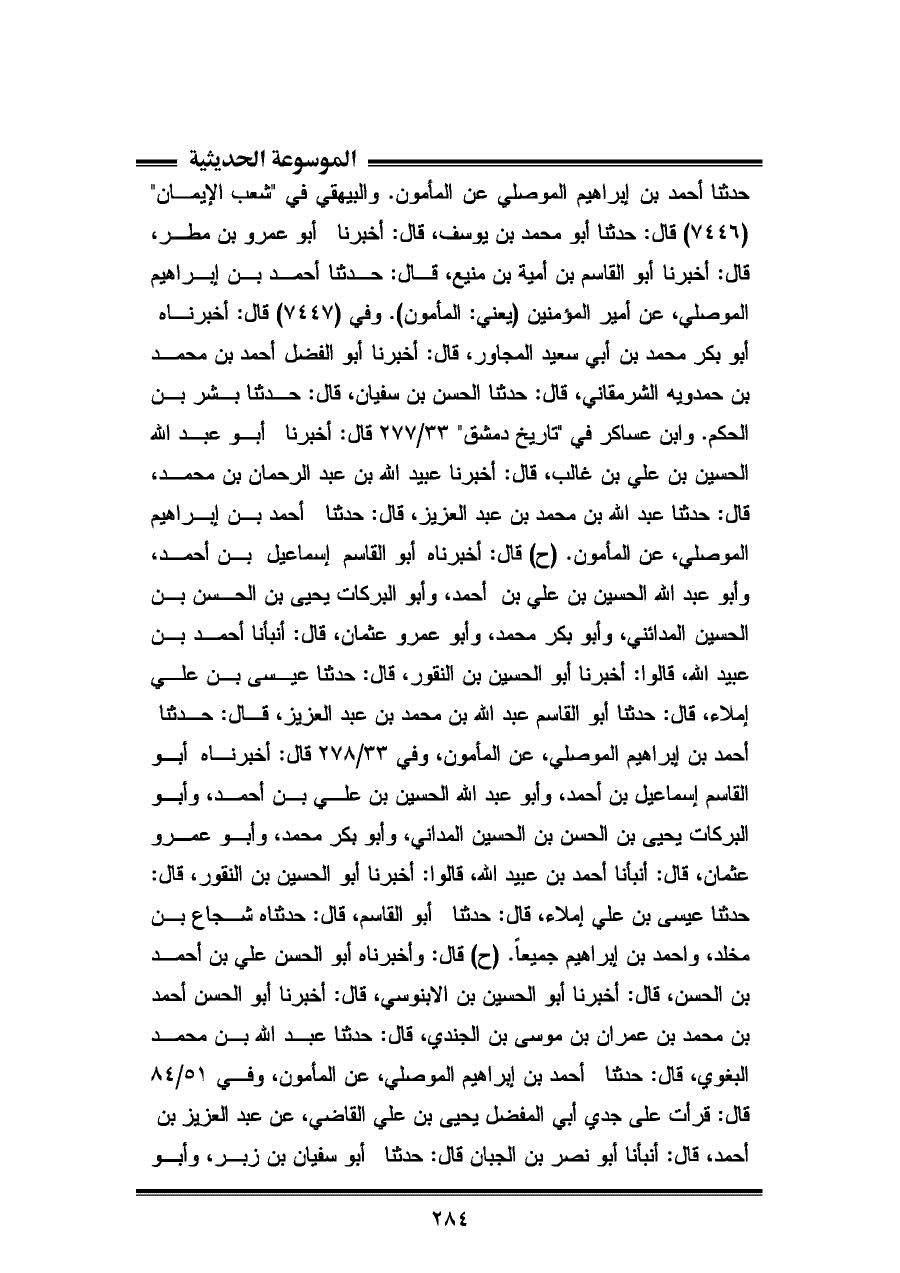 الحسن محمد بن أحمد البغدادي الواعظ، قالا: حدثنا عبد الله بن محمد البغوي، قال: حدثنا أحمد بن إبراهيم الموصلي، عن المأمون.