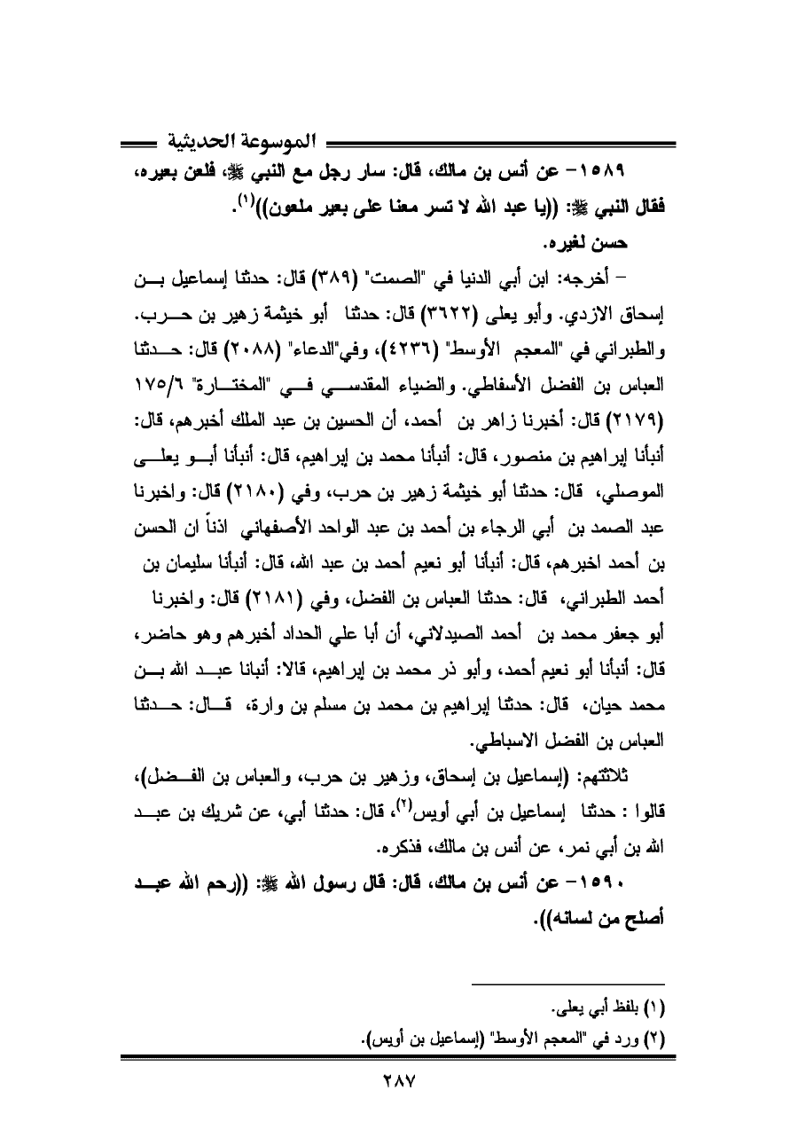١٥٩١ - عن أنس بن مالك، سمعت رسول الله - صلى الله عليه وسلم -، يقول لعلى بن أبي طالب - رضي الله عنه - "يا علي استكثر من المعارف من المؤمنين فكم من معرفة في الدنيا بركة في الآخرة" ثم جاء من بعد فقال له رسول الله - صلى الله عليه وسلم -: "ما فعلت فيما أمرتك"؟ فقال: قد فعلت يا رسول الله، فقال له عليه السلام: "اذهب فابل أخبارهم"، فأتى على النبي - صلى الله عليه وسلم - وهو منكس رأسه، فقال له النبي - صلى الله عليه وسلم - وهو يبتسم: "ما أحسب يا على ثبت معك إلا أبناء الآخرة". فقال له على: لا والذي بعثك بالحق، فقال له النبي - صلى الله عليه وسلم -:" {الْأَخِلَّاءُ يَوْمَئِذٍ بَعْضُهُمْ لِبَعْضٍ عَدُوٌّ إِلَّا الْمُتَّقِينَ}، يا على أقبل على شأنك، وأملك لسانك. وأعقل من تعاشره من أهل زمانك تكن غانمًا".