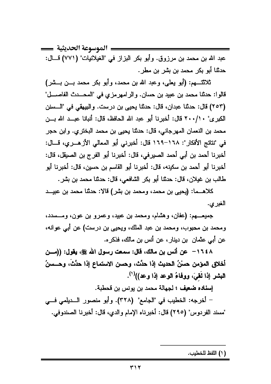 كلاهما: (الخطيب، والصندوفي) عن محمد بن عيسى الهمذاني، قال: حدثنا صالح بن أحمد الحافظ (¬١)، قال: حدثنا إبراهيم بن محمد بن يعقوب أبو إسحاق، قال: حدثنا محمد بن يونس بن قحطبة المصيصى، قال: حدثنا محمد بن كثير، قال: حدثنا معمر، عن قتادة، عن أنس بن مالك، فذكره.