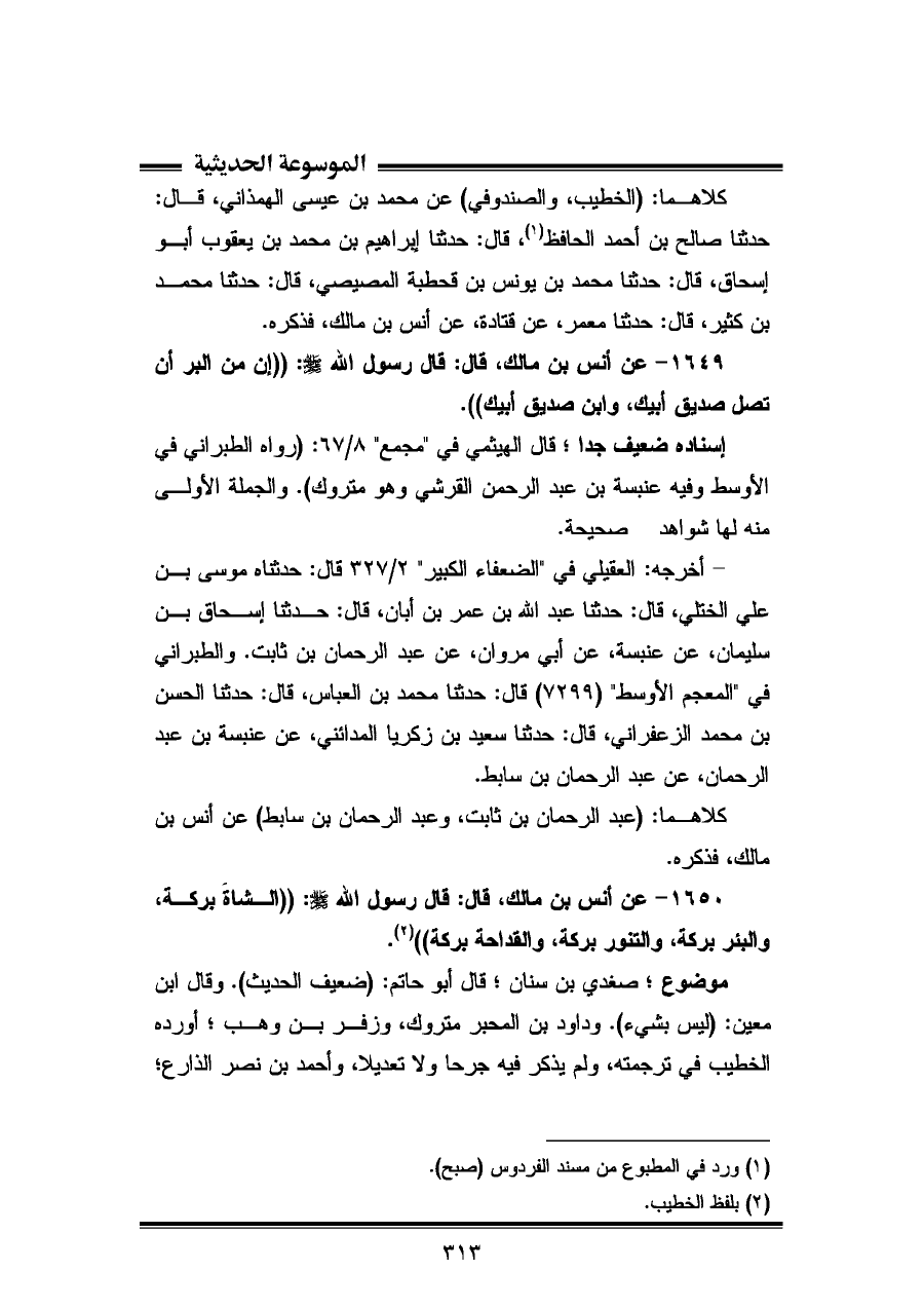 كلاهما: (عنبسة بن عبد الرحمان، وداود بن محبر) قالا: حدثنا صغدي بن سنان بن عبد الله، عن قتادة، عن أنس بن مالك، فذكره.