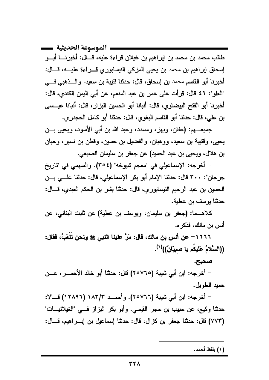 حدثنا عثمان بن مطر، وفي (٧٧٤) قال: حدثنا محمد بن الأزهر، قال: حدثنا أبو الوليد، قال: حدثنا حماد، وفي (٧٧٥) قال: حدثنا أحمد بن كثير المرثدي، قال: حدثنا علي بن الجعد، قال: أنبأنا شعبة، عن سيار (يعني: ابن أبي الحكم). وابن السني في "عمل اليوم والليلة" (٢٢٧) قال: أخبرني عثمان بن سهل، عن مخلد، قال: حدثنا محمد بن إسماعيل، قال: حدثنا وكيع، عن حبيب بن حجر القيسي. وابن عدي في "الكامل" ٦/ ٢٧٨ قال: حدثنا محمود بن عبد البر، قال: حدثنا إسماعيل الترجماني، قال: حدثنا عثمان بن مطر البصري. وأبو نعيم في "حلية الأولياء" ٨/ ٣٧٨ قال: حدثنا علي بن هارون، قال: حدثنا موسى بن هارون، قال: حدثنا مجاهد بن موسى، قال: حدثنا وكيع، قال: حدثنا حبيب. وابن عساكر في "تاريخ دمشق" ٣/ ٣٧٠ - ٣٨٠ قال: أخبرنا أبو القاسم بن الحصين، قال: أنبأنا أبو طالب بن غيلان، قال: أنبأنا أبو بكر الشافعي، قال: أنبأنا محمد بن الأزهر، قال: أنبأنا أبو الوليد، قال: أنبأنا حماد (يعني: ابن سلمة).