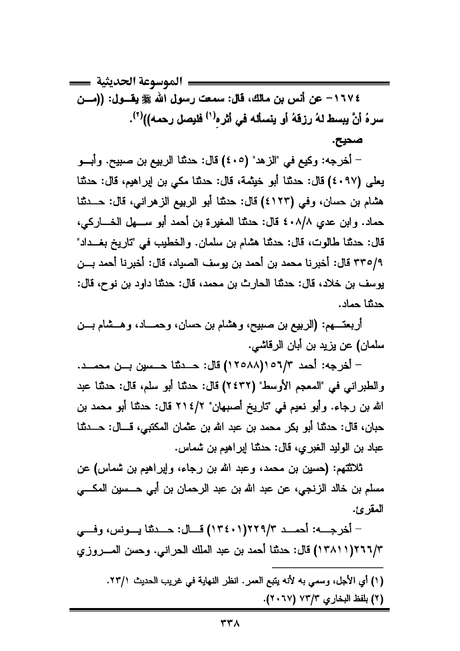 (كما في البر وصلة) لابن المبارك: ١٦٥ قال: أخبرنا الفضل بن موسى. وابن أبي الدنيا في "مكارم أخلاق" (٢٤٤) قال: حدثنا أحمد بن المقدم العجلي، وغيرة. والعقيلي في "الضعفاء الكبير" ٤/ ١٨٩ قال: حدثناه على بن عبد العزيز، قال: حدثنا عمرو بن عون. وابن عدي في "الكامل" ٨/ ١٦١ قال: حدثنا محمد بن عبد الواحد الناقد، قال: حدثنا أبو الأشعث أحمد بن المقدام. وأبو نعيم في "حلية الأولياء" ٣/ ١٠٧ قال: حدثنا محمد بن إسحاق بن إبراهيم القاضي، قال: حدثنا أحمد بن أبي صلابة، قال: حدثنا مسدد. والبيهقي في "شعب الإيمان" (٧٨٥٥) قال: أخبرنا أبو الفتح هلال بن محمد الحفار، قال: أخبرنا الحسين بن يحيى بن عياش القطان، قال: حدثنا أبو الأشعث. وابن الفضل الجوزي الأصبهاني في "الترغيب والترهيب" (٤٢١) قال: أخبرنا محمد بن إسماعيل التفليسي، قال: أنبأنا حمزة بن عبد العزيز المهلبي، قال: أنبأنا محمد بن أحمد بن دلوية، قال: حدثنا محمد بن إسماعيل البخاري، قال: حدثنا محمد بن سعيد الخزاعي.