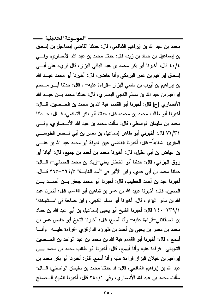 أبو يحيى إسماعيل بن أبي عبد الله بن حماد بن العسقلاني - قراءة عليه وأنا أسمع، قال: أخبرنا الشيخ أبو حفص عمر بن محمد بن معمر بن يحيى بن أحمد بن طيرزد الدارقزي قراءة عليه وأنا أسمع، قال: أخبرنا أبو القاسم هبة الله بن محمد بن عبد الواحد بن الحصين الشيباني قراءة عليه وأنا أسمع، قال: أخبرنا أبو طالب محمد بن محمد بن إبراهيم بن غيلان البزاز قراءة عليه وأنا أسمع، قال: أخبرنا أبو بكر محمد بن عبد الله بن إبراهيم الشافعي، قال: أخبرنا القاضي إسماعيل بن إسحاق بن إسماعيل بن حماد بن زيد، قال: حدثنا محمد بن عبد الله الأنصاري.