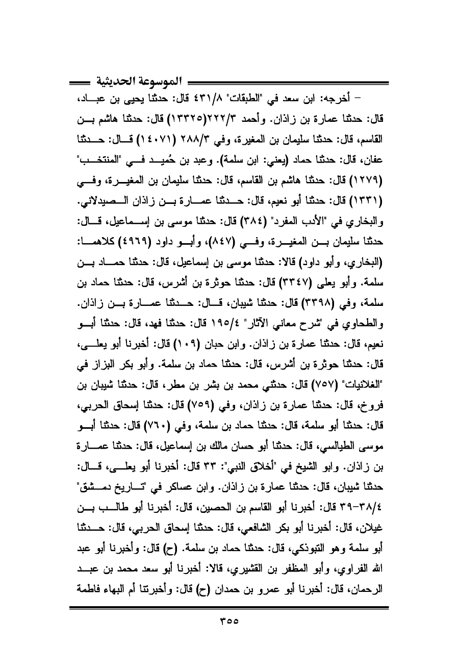 بنت محمد بن أحمد وأم المجتبى فاطمة بنت ناصر، قالتا: أنبأنا إبراهيم بن منصور السلمي، قال: أخبرنا أبو بكر المقرئ، قالا: أخبرنا أبو يعلى الموصلى، قال: حدثنا جويريه - زاد بن حمدان بن أشرس، قال: حدثنا حماد بن سلمة، وفي ٤/ ٣٩ قال: أخبرنا أبو القاسم بن الحصين، قال: أخبرنا أبو طالب بن غيلان، قال: أخبرنا أبو بكر الشافعي، قال: حدثنا أبو موسى الطيالسي وأسمه عيسى بن عبد الله زغاث، قال: حدثنا أبو غسان مالك بن إسماعيل، قال: حدثنا عمارة بن زاذان (ح) قال: أخبرنا أبو القاسم بن الحصين، قال: أخبرنا أبو طالب بن غيلان، قال: أخبرنا أبو بكر الشافعي، قال: وأخبرنا الشافعي، قال: حدثني محمد بن بشر، قال: حدثنا شيبان بن فروخ، قال: حدثنا عمارة بن زاذان (¬١).
