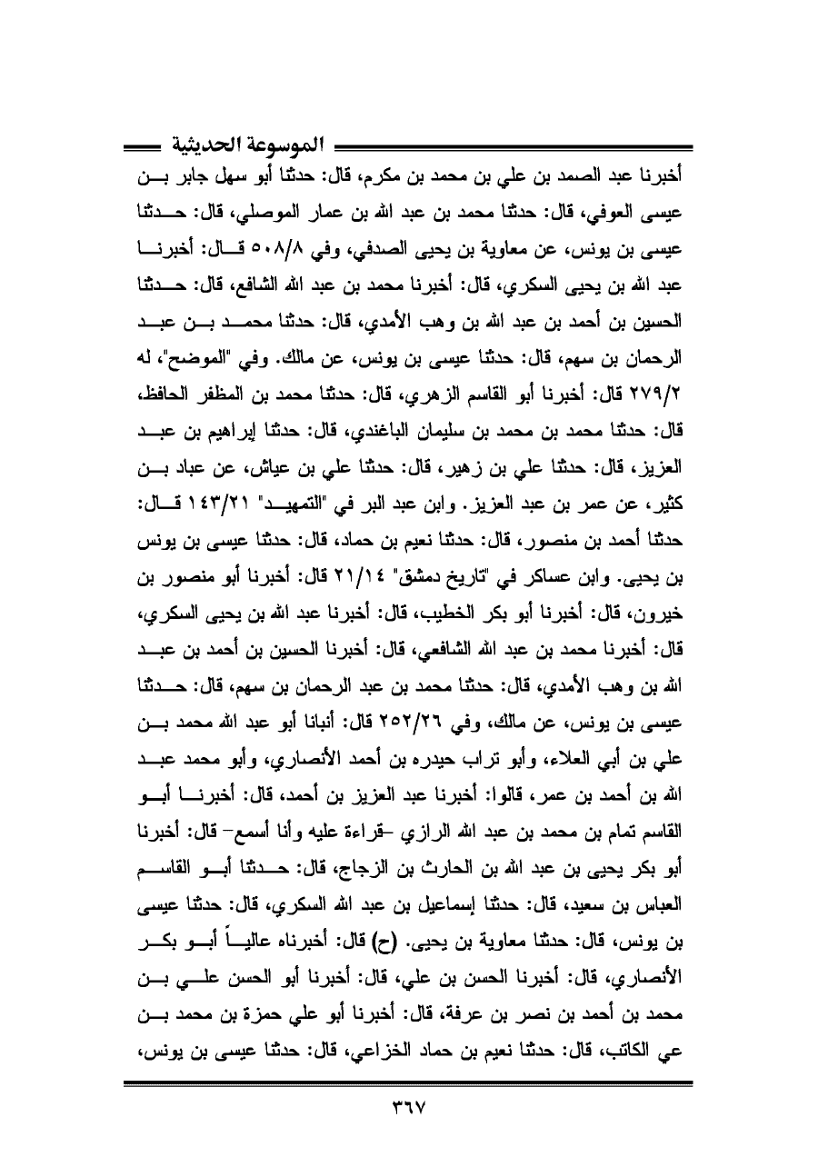 قال: حدثنا معاوية بن يحيى، وفي ٥٩/ ٢٨٤ قال: أخبرنا أبو القاسم بن السمر قندي، قال: أخبرنا أبو محمد الصريفيني، قال: أخبرنا أبو القاسم بن حبابة (ح) قال: وأخبرنا أبو بكر محمد بن الحسين، وأبو يعقوب يوسف بن أيوب بن الحسين، قالا: حدثنا أبو القاسم البغوي، قال: حدثنا محمد بن عبد الرحمان بن سهم الأنطاكي، قال: حدثنا عيسى بن يونس، عن معاوية بن يحيى. وابن النجار في "ذيل تاريخ بغداد" ١٦/ ٤٠٢ قال: قرأت بخط أبي نصر البيع، وأنبأنيه عنه أبو القاسم الازجي، قال: أنبأنا القاضي الإمام أبو الفضل عبد الوهاب بن محمد بن الفضل بن مصعب الأصبهاني قدم علينا وكتب أبو عبد الله محمد بن أبي زيد بن أحمد الأصبهاني، قال: أنبأنا أبو طاهر إسحاق بن أحمد بن جعفر الواشتياني، قالا: أنبأنا أبو بكر محمد بن عبد الله بن ريذة، قال: حدثنا أبو القاسم سليمان بن أحمد بن أيوب الطبراني، قال: حدثنا أحمد بن محمد بن أبي موسى الأنطاكي، قال: حدثنا عبد الرحمان بن سهم الأنطاكي، قال: حدثنا عيسى بن يونس، عن معاوية بن يحيى، ومالك بن أنس.
