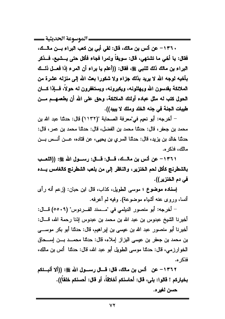 ١٣٦٠ - عن أنس بن مالك، قال: لقى أبي بن كعب البراء بن مالك، فقال: يا أخى ما تشتهى، قال: سويقًا وتمرا فجاء فأكل حتى يشبع، فذكر البراء بن مالك ذلك للنبي -صلى الله عليه وسلم-، فقال: "أعلم يا براء أن المرء إذا فعل ذلك بأخيه لوجه الله لا يريد بذلك جزاء ولا شكورا بعث الله إلى منزله عشرة من الملائكة يقدسون الله ويهللونه، ويكبرونه، ويستغفرون له حولًا، فإذا كان الحول كتب له مثل عباده أولئك الملائكة، وحق على الله أن يطعمهم من طيبات الجنة في جنه الخلد وملك لا يبيد".