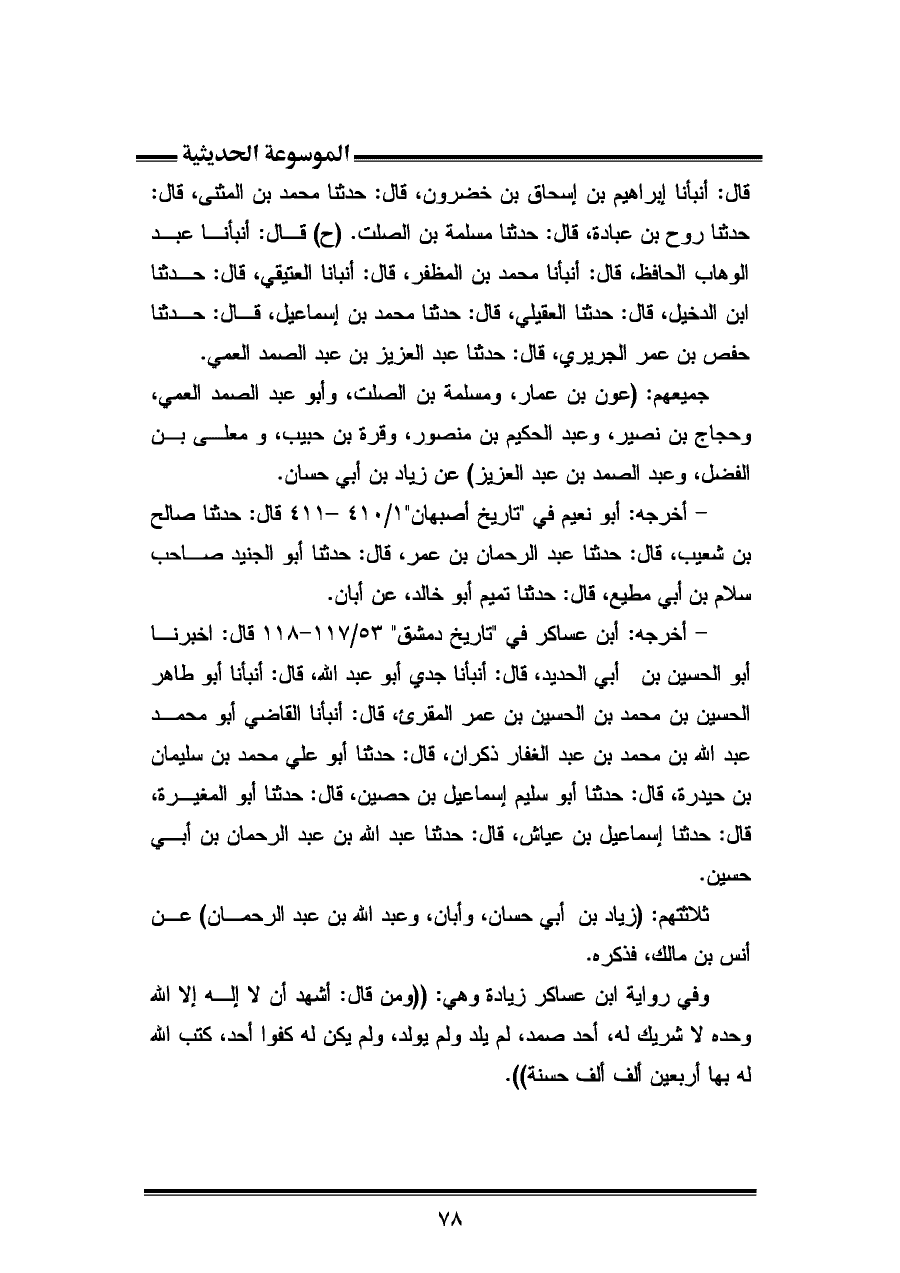 وفي رواية ابن عساكر زيادة وهي: "ومن قال: أشهد أن لا إله إلا الله وحده لا شريك له، أحد صمد، لم يلد ولم يولد، ولم يكن له كفوا أحد، كتب الله له بها أربعين ألف ألف حسنة".