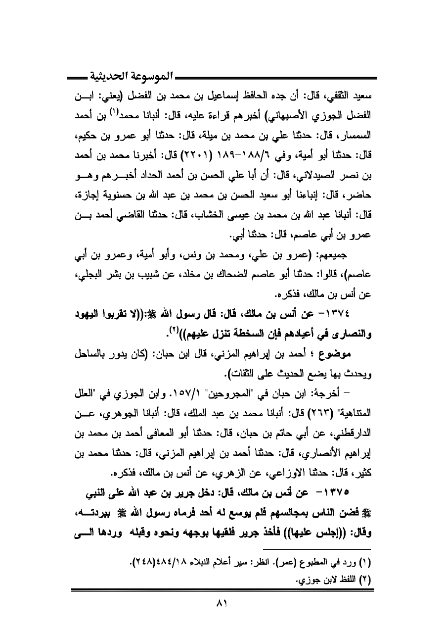 سعيد الثقفي، قال: أن جده الحافظ إسماعيل بن محمد بن الفضل (يعني: ابن الفضل الجوزي الأصبهاني) أخبرهم قراءة عليه، قال: أنبأنا محمد (¬١) بن أحمد السمسار، قال: حدثنا علي بن محمد بن ميلة، قال: حدثنا أبو عمرو بن حكيم، قال: حدثنا أبو أمية، وفي ٦/ ١٨٨ - ١٨٩ (٢٢٠١) قال: أخبرنا محمد بن أحمد بن نصر الصيدلاني، قال: أن أبا علي الحسن بن أحمد الحداد أخبرهم وهو حاضر، قال: أنبأنا أبو سعيد الحسن بن محمد بن عبد الله بن حسنوية إجازة، قال: أنبأنا عبد الله بن محمد بن عيسى الخشاب، قال: حدثنا القاضي أحمد بن عمرو بن أبي عاصم، قال: حدثنا أبي.