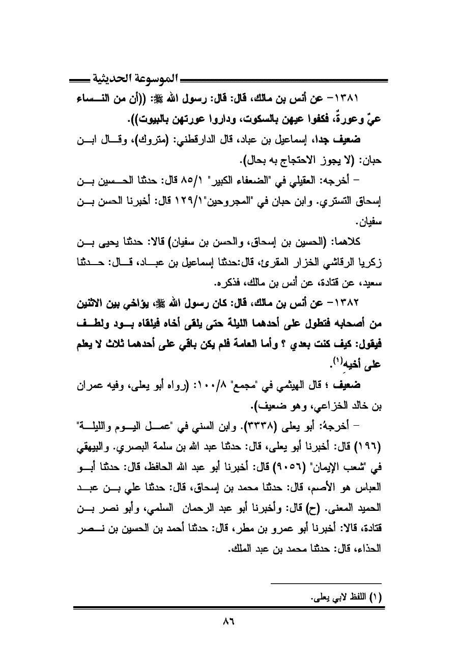 ١٣٨١ - عن أنس بن مالك، قال: قال: رسول الله -صلى الله عليه وسلم-: "أن من النساء عيٌ وعورةٌ، فكفوا عيهن بالسكوت، وداروا عورتهن بالبيوت".