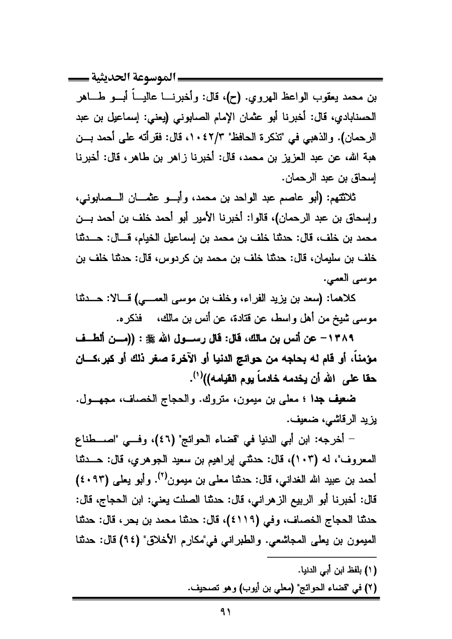 ١٣٨٩ - عن أنس بن مالك، قال: قال رسول الله -صلى الله عليه وسلم-: "من ألطف مؤمنًا، أو قام له بحاجه من حوائج الدنيا أو الآخرة صغر ذلك أو كبر، كان حقا على الله أن يخدمه خادمًا يوم القيامة" (¬١).