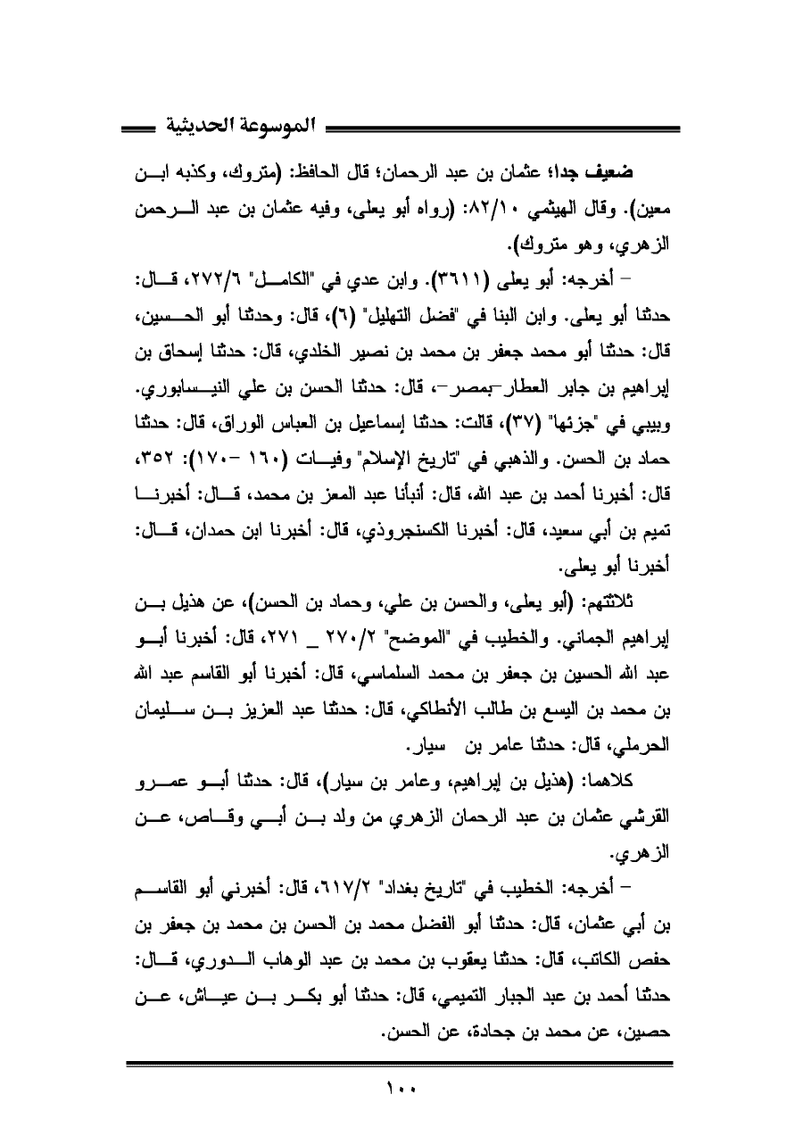 - أخرجه: أبو يعلى (٣٦١١). وابن عدي في "الكامل" ٦/ ٢٧٢، قال: حَدَّثَنَا أبو يعلى. وابن البنا في "فضل التهليل" (٦)، قال: وحدثنا أبو الحسين، قال: حَدَّثَنَا أبو محمد جعفر بن محمد بن نصير الخلدي، قال: حَدَّثَنَا إسحاق بن إبراهيم بن جابر العطار - بمصر -، قال: حَدَّثَنَا الحسن بن علي النيسابوري. وبيبي في "جزئها" (٣٧)، قالت: حَدَّثَنَا إسماعيل بن العباس الوراق، قال: حَدَّثَنَا حماد بن الحسن. والذهبي في "تاريخ الإسلام" وفيات (١٦٠ - ١٧٠): ٣٥٢، قال: أخبرنا أحمد بن عبد الله، قال: أنبأنا عبد المعز بن محمد، قال: أخبرنا تميم بن أبي سعيد، قال: أخبرنا الكسنجروذى، قال: أخبرنا ابن حمدان، قال: أخبرنا أبو يعلى.