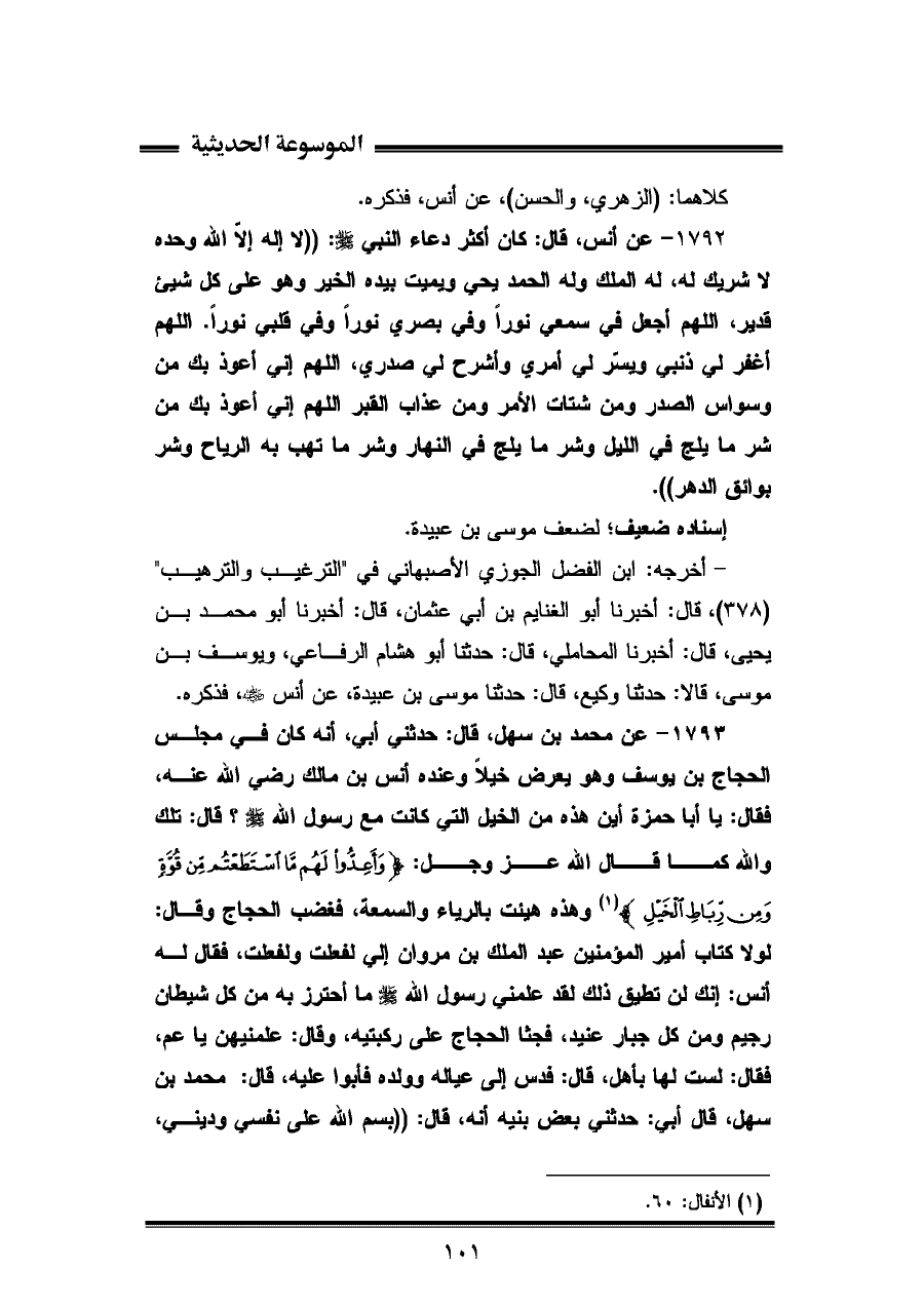 ١٧٩٣ - عن محمد بن سهل، قال: حدثني أبى، أنه كان في مجلس الحجاج بن يوسف وهو يعرض خيلًا وعنده أنس بن مالك رضي الله عنه، فقال: يا أبا حمزة أين هذه من الخيل التى كانت مع رسول اللّه - صلى الله عليه وسلم -؟ قال: تلك والله كما قال اللّه عَزَّ وَجَلَّ: {وَأَعِدُّوا لَهُمْ مَا اسْتَطَعْتُمْ مِنْ قُوَّةٍ وَمِنْ رِبَاطِ الْخَيْلِ} (¬١) وهذه هيئت بالرياء والسمعة، فغضب الحجاج وقال: لولا كتاب أمير المؤمنين عبد الملك بن مروان إلى لفعلت ولفعلت، فقال له أنس: إنك لن تطيق ذلك لقد علمنى رسول اللّه - صلى الله عليه وسلم - ما أحترز به من كل شيطان رجيم ومن كل جبار غيد، فجثا الحجاج على ركبتيه، وقال: علمنيهن يا عم، فقال: لست لها بأهل، قال: فدس إلى عياله وولده فأبوا عليه، قال: محمد بن سهل، قال أبى: حدثنى بعض بنيه أنه، قال: "بسم اللّه على نفسى ودينى،