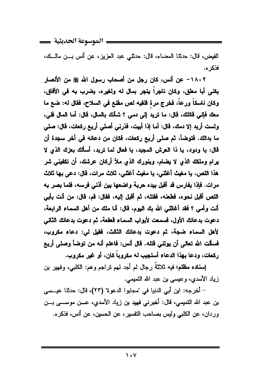 ١٨٠٢ - عن أنس، كان رجل من أصحاب رسول الله - صلى الله عليه وسلم - من الأنصار يكنى أبا معلق، وكان تاجرًا يتجر بمال له ولغيره، يضرب به في الأفاق، وكان ناسكًا ورعًا، فخرج مرة فلقيه لص مقنع في السلاح، فقال له: ضع ما معك فإني قاتلك، قال: ما تريد إلى دمي؟ شأنك بالمال، قال: أما المال فلي، ولست أريد إِلَّا دمك، قال: أما إذا أبيت، فذرني أصلي أربع ركعات، قال: صلي ما بدا لك. فتوضأ، ثم صلى أربع ركعات، فكان من دعائه في آخر سجدة أن قال: يا ودود يا ذا العرش المجيد، يا فعال لما تريد، أسألك بعزك الذي لا يرام وملكك الذي لا يضام، وبنورك الذي ملأ أركان عرشك، أن تكفيني شر هذا اللص، يا مغيث أغثني، يا مغيث أغثني، ثلاث مرات، قال: دعي بها ثلاث مرات. فإذا بفارس قد أقبل بيده حربة واضعها بين أذني فرسه، فلما بصر به اللص أقبل نحوه، فطعنه، فقتله، ثم أقبل إليه، فقال: قم، قال: من أنت بأبي أنت وأمي؟ فقد أغاثني الله بك اليوم، قال: أنا ملك من أهل السماء الرابعة، دعوت بدعائك الأول، فسمعت لأبواب السماء قعقعة، ثم دعوت بدعائك الثاني لأهل السماء ضجة، ثم دعوت بدعائك الثالث، فقيل لي: دعاء مكروب فسألت الله تعالى أن يولني قتله. قال أنس: فاعلم أنه من توضأ وصلى أربع ركعات، ودعا بهذا الدعاء استجيب له مكروبا كان، أو غير مكروب.
