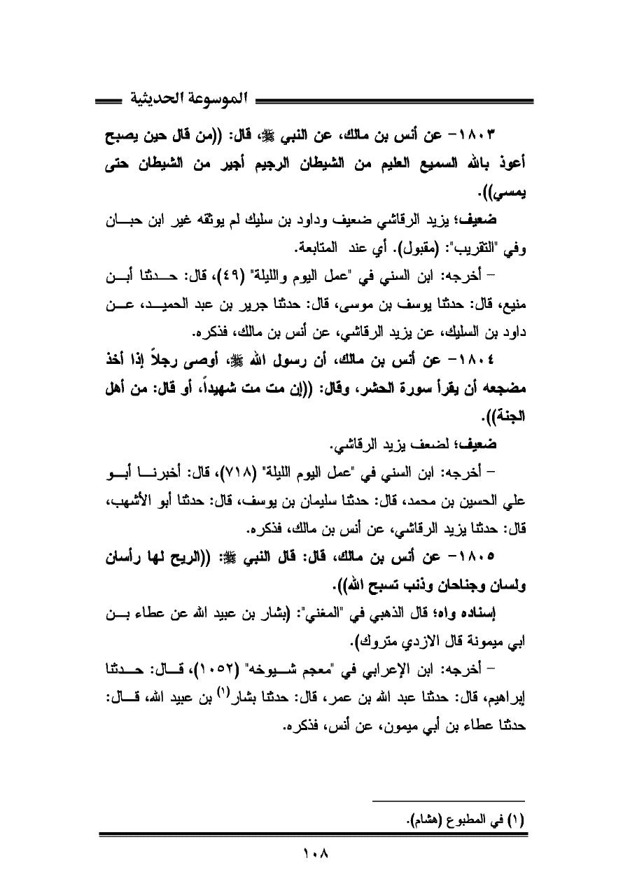 ١٨٠٣ - عن أمس بن مالك، عن النَّبِيّ - صلى الله عليه وسلم -، قال: "من قال حين يصبح أعوذ باللّه السميع العليم من الشيطان الرجيم أجير من الشيطان حتى يسمي".