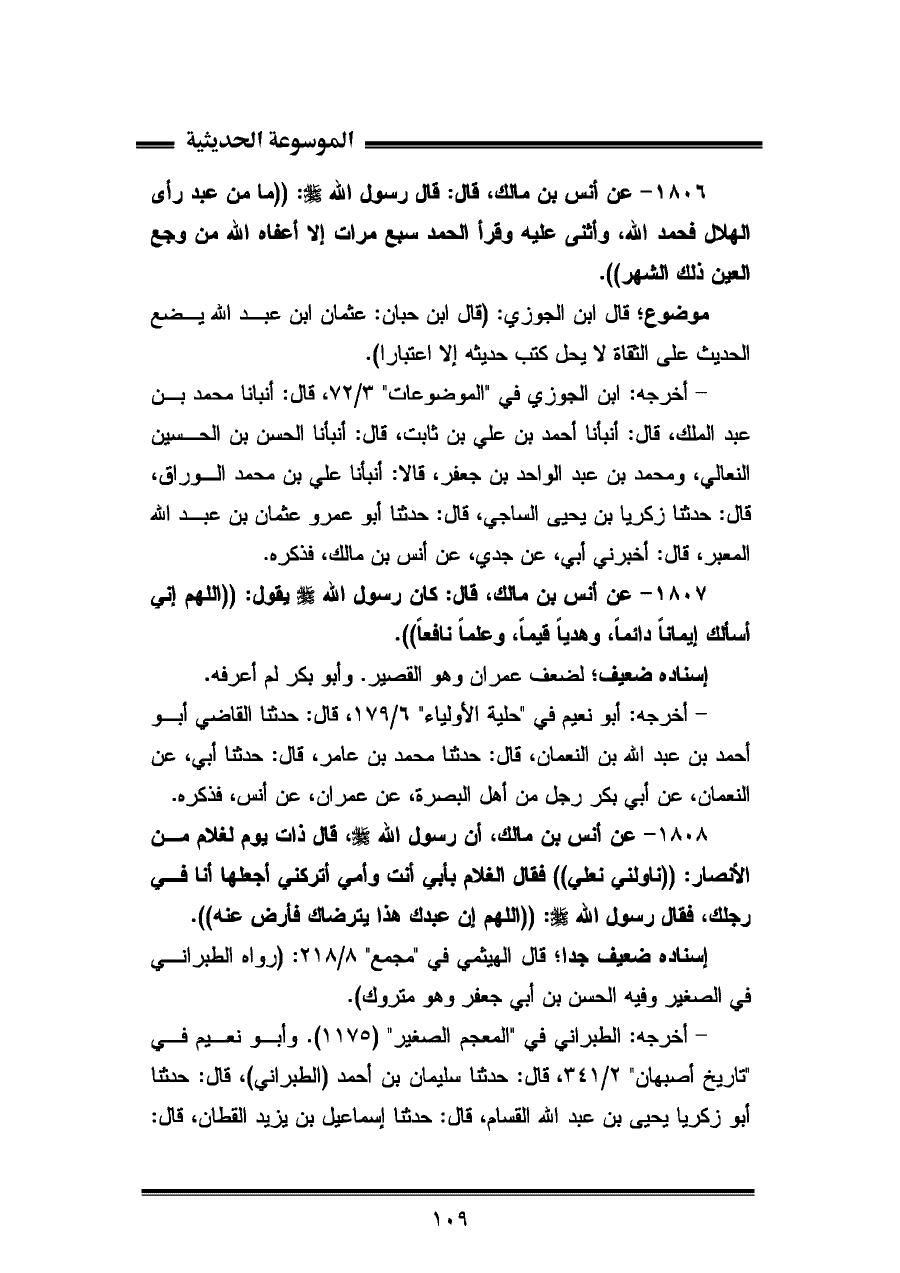 ١٨٠٦ - عن أنس بن مالك، قال: قال رسول اللّه - صلى الله عليه وسلم -: "ما من عبد رأى الهلال فحمد اللّه، وأثنى عليه وقرأ الحمد سبع مرات إِلَّا أعفاه الله من وجع العين ذلك الشهر".