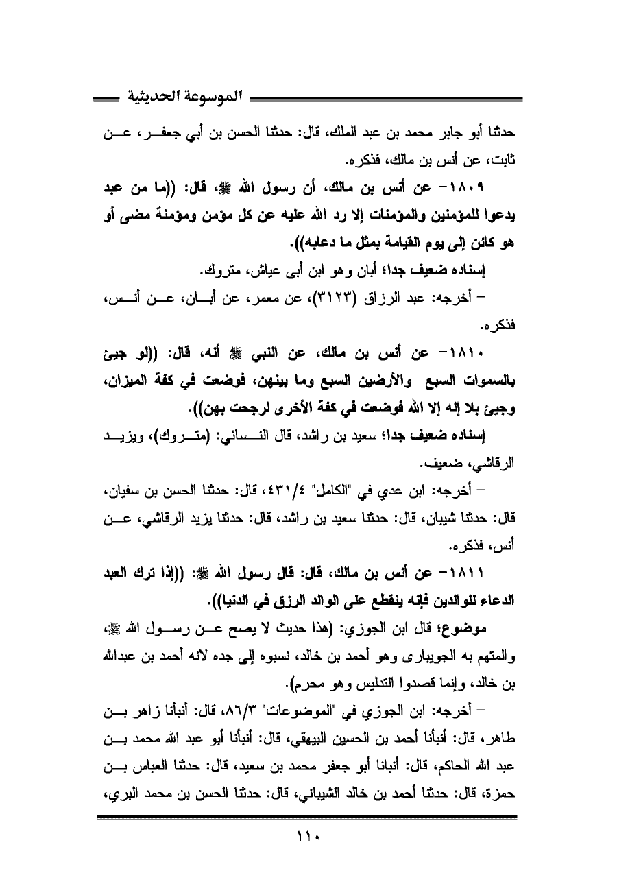 ١٨٠٩ - عن أنس بن مالك، أن رسول اللّه - صلى الله عليه وسلم -، قال: "ما من عبد يدعوا للمؤمنين والمؤمنات إِلَّا رد الله عليه عن كل مؤمن ومؤمنة مضى أو هو كائن إلى يوم القيامة بمثل ما دعا به".