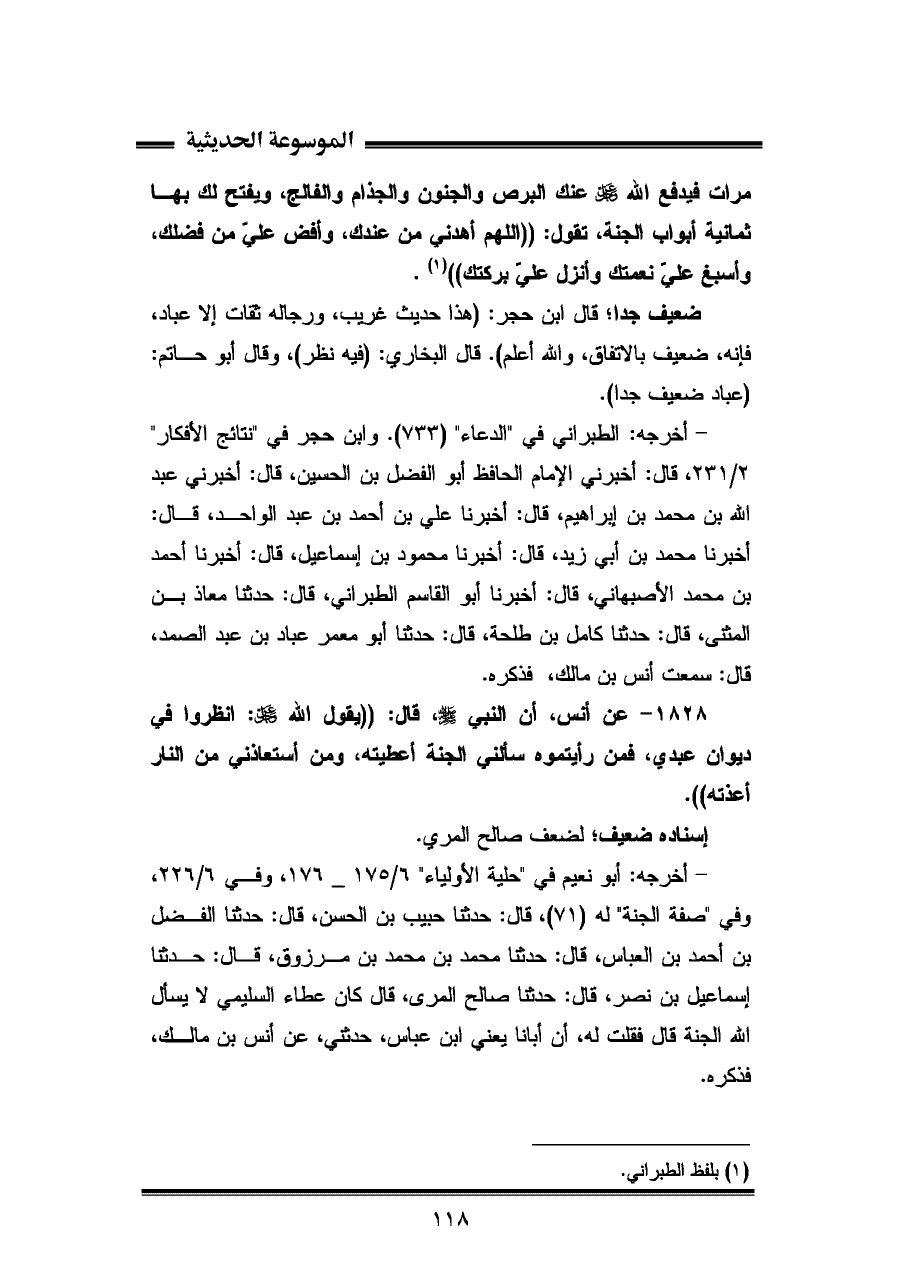 ١٨٢٨ - عن أنس، أن النَّبِيّ - صلى الله عليه وسلم -، قال: "يقول اللّه عز وجل: انظروا في ديوان عبدي، فمن رأيتموه سألنى الجنة أعطيته، ومن استعاذنى من النار أعذته".