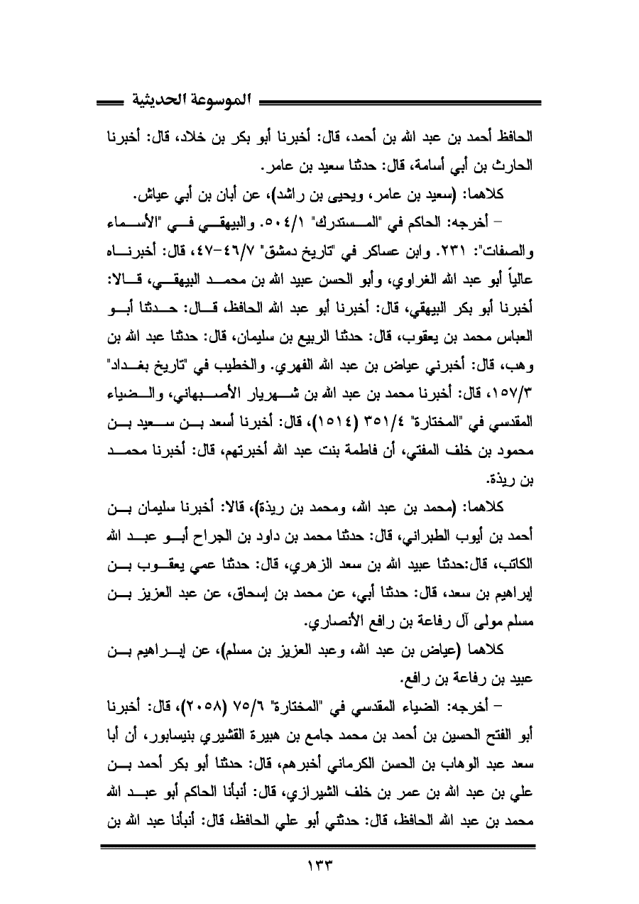 الحافظ أحمد بن عبد الله بن أحمد، قال: أخبرنا أبو بكر بن خلاد، قال: أخبرنا الحارث بن أبي أسامة، قال: حَدَّثَنَا سعيد بن عامر.