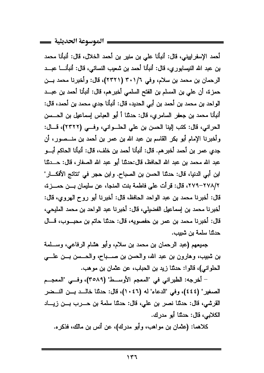 أحمد الإسفراييني، قال: أنبأنا على بن منير بن أحمد الخلال، قال: أنبأنا محمد بن عبد الله النيسابوري، قال: أنبأنا أحمد بن شعيب النسائي، قال: أنبأنا عبد الرحمان بن محمد بن سلام، وفي ٦/ ٣٠١ (٢٣٢١)، قال: وأخبرنا محمد بن حمزة، أن علي بن المسلم بن الفتح السلمي أخبرهم، قال: أنبأنا أحمد بن عبد الواحد بن محمد بن أحمد بن أبي الحديد، قال: أنبأنا جدي محمد بن أحمد، قال: أنبأنا محمد بن جعفر السامري، قال: حَدَّثَنَا أ أبو العباس إسماعيل بن الحسن الحراني، قال: كتب إلينا الحسن بن علي الحلواني، وفي (٢٣٢٢)، قال: وأخبرنا الإمام أبو بكر القاسم بن عبد الله بن عمر بن أحمد بن منصور، أن جدي عمر بن أحمد أخبرهم. قال: أنبأنا أحمد بن خلف، قال: أنبأنا الحاكم أبو عبد الله محمد بن عبد الله الحافظ، قال: حَدَّثَنَا أبو عبد الله الصفار، قال: حَدَّثَنَا ابن أبي الدنيا، قال: حَدَّثَنَا الحسن بن الصباح. وابن حجر في "نتائج الأفكار" ٢/ ٢٧٨ - ٢٧٩، قال: قرأت على فاطمة بنت المنجا، عن سليمان بن حمزة، قال: أخبرنا محمد بن عبد الواحد الحافظ، قال: أخبرنا أبو روح الهروي، قال: أخبرنا محمد بن إسماعيل الفضيلي، قال: أخبرنا عبد الواحد بن محمد المليحي، قال: أخبرنا محمد بن عمر بن حفصويه، قال: حَدَّثَنَا حاتم بن محبوب، قال حَدَّثَنَا سلمة بن شبيب.