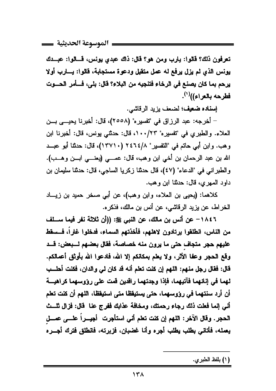 - أخرجه: عبد الرزاق في "تفسيره" (٢٥٥٨)، قال: أخبرنا يحيى بن العلاء. والطبري في "تفسيره" ٢٣/ ١٠٠، قال: حدثني يونس، قال: أخبرنا ابن وهب. وابن أبي حاتم في "التفسير" ٨/ ٢٤٦٤ (١٣٧١٠)، قال: حَدَّثَنَا أبو عبد الله بن عبد الرحمان بن أخي ابن وهب، قال: عمي (يعنى ابن وهب). والطبراني في "الدعاء" (٤٧)، قال حَدَّثَنَا زكريا الساجي، قال: حَدَّثَنَا سليمان بن داود المهري، قال: حَدَّثَنَا ابن وهب.