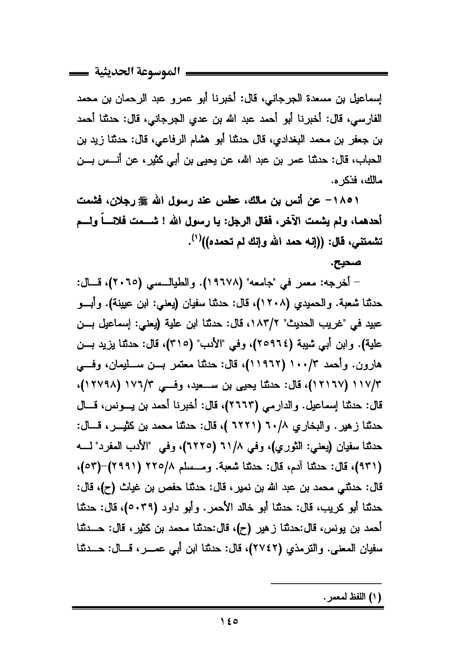 ١٨٥١ - عن أنس بن مالك، عطس عند رسول اللّه - صلى الله عليه وسلم - رجلان، فشمت أحدهما، ولم يشمت الآخر، فقال الرجل: يا رسول الله! شمت فلانًا ولم تشمتني، قال: "إنه حمد الله وإنك لم تحمده" (¬١).