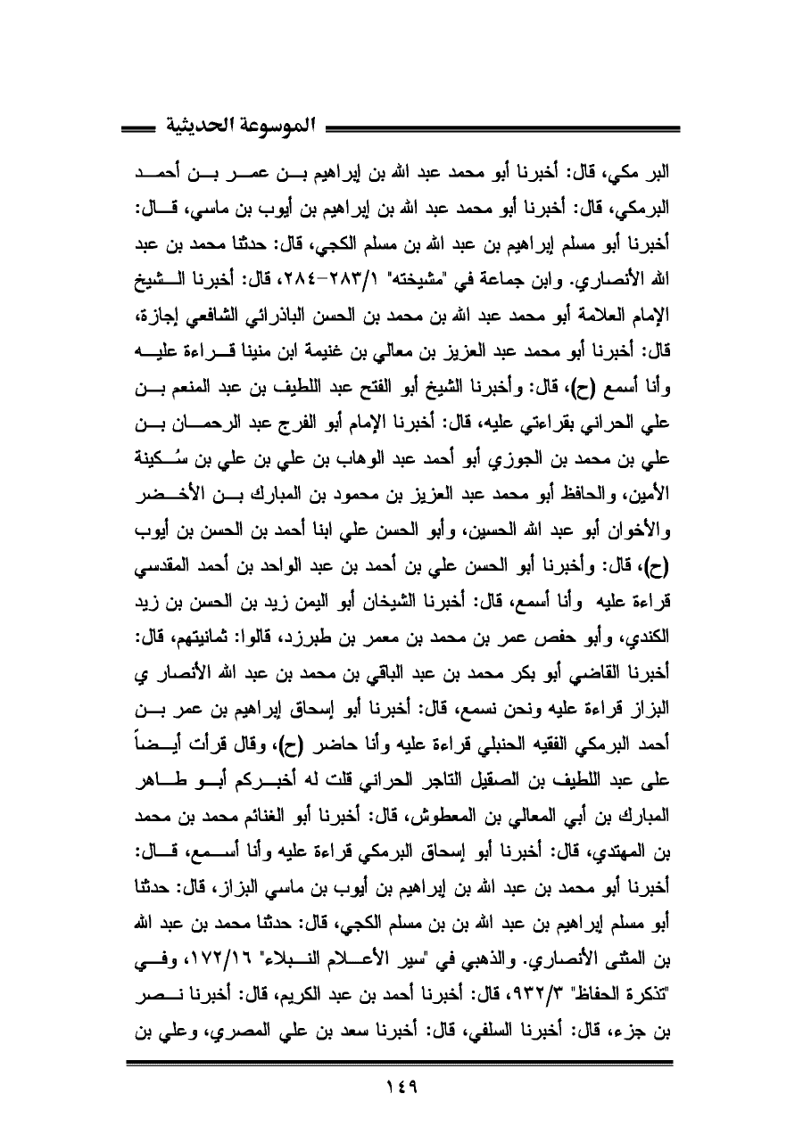 البرمكى، قال: أخبرنا أبو محمد عبد الله بن إبراهيم بن عمر بن أحمد البرمكي، قال: أخبرنا أبو محمد عبد الله بن إبراهيم بن أيوب بن ماسي، قال: أخبرنا أبو مسلم إبراهيم بن عبد الله بن مسلم الكجى، قال: حدثنا محمد بن عبد الله الأنصاري. وابن جماعة في "مشيخته" ١/ ٢٨٣ - ٢٨٤، قال: أخبرنا الشيخ الإمام العلامة أبو محمد عبد الله بن محمد بن الحسن الباذرائي الشافعي إجازة، قال: أخبرنا أبو محمد عبد العزيز بن معالي بن غنيمة ابن منينا قراءة عليه وأنا أسمع (ح)، قال: وأخبرنا الشيخ أبو الفتح عبد اللطيف بن عبد المنعم بن علي الحراني بقراءتي عليه، قال: أخبرنا الإمام أبو الفرج عبد الرحمان بن علي بن محمد بن الجوزي أبو أحمد عبد الوهاب بن علي بن علي بن سُكينة الأمين، والحافظ أبو محمد عبد العزيز بن محمود بن المبارك بن الأخضر والأخوان أبو عبد الله الحسين، وأبو الحسن علي ابنا أحمد بن الحسن بن أيوب (ح)، قال: وأخبرنا أبو الحسن علي بن أحمد بن عبد الواحد بن أحمد المقدسي قراءة عليه وأنا أسمع، قال: أخبرنا الشيخان أبو اليمن زيد بن الحسن بن زيد الكندي، وأبو حفص عمر بن محمد بن معمر بن طبرزد، قالوا: ثمانيتهم، قال: أخبرنا القاضي أبو بكر محمد بن عبد الباقي بن محمد بن عبد الله الأنصاري البزاز قراءة عليه ونحن نسمع، قال: أخبرنا أبو إسحاق إبراهيم بن عمر بن أحمد البرمكي الفقيه الحنبلي قراءة عليه وأنا حاضر (ح)، وقال قرأت أيضًا على عبد اللطيف بن الصقيل التاجر الحراني قلت له أخبركم أبو طاهر المبارك بن أبي المعالي بن المعطوش، قال: أخبرنا أبو الغنائم محمد بن محمد بن المهتدي، قال: أخبرنا أبو إسحاق البرمكي قراءة عليه وأنا أسمع، قال: أخبرنا أبو محمد بن عبد الله بن إبراهيم بن أيوب بن ماسي البزاز، قال: حدثنا أبو مسلم إبراهيم بن عبد الله بن بن مسلم الكجي، قال: حدثنا محمد بن عبد الله بن المثنى الأنصاري. والذهبي في "سير الأعلام النبلاء" ١٦/ ١٧٢، وفي "تذكرة الحفاظ" ٣/ ٩٣٢، قال: أخبرنا أحمد بن عبد الكريم، قال: أخبرنا نصر بن جزء، قال: أخبرنا السلفي، قال: أخبرنا سعد بن علي المصري، وعلي بن