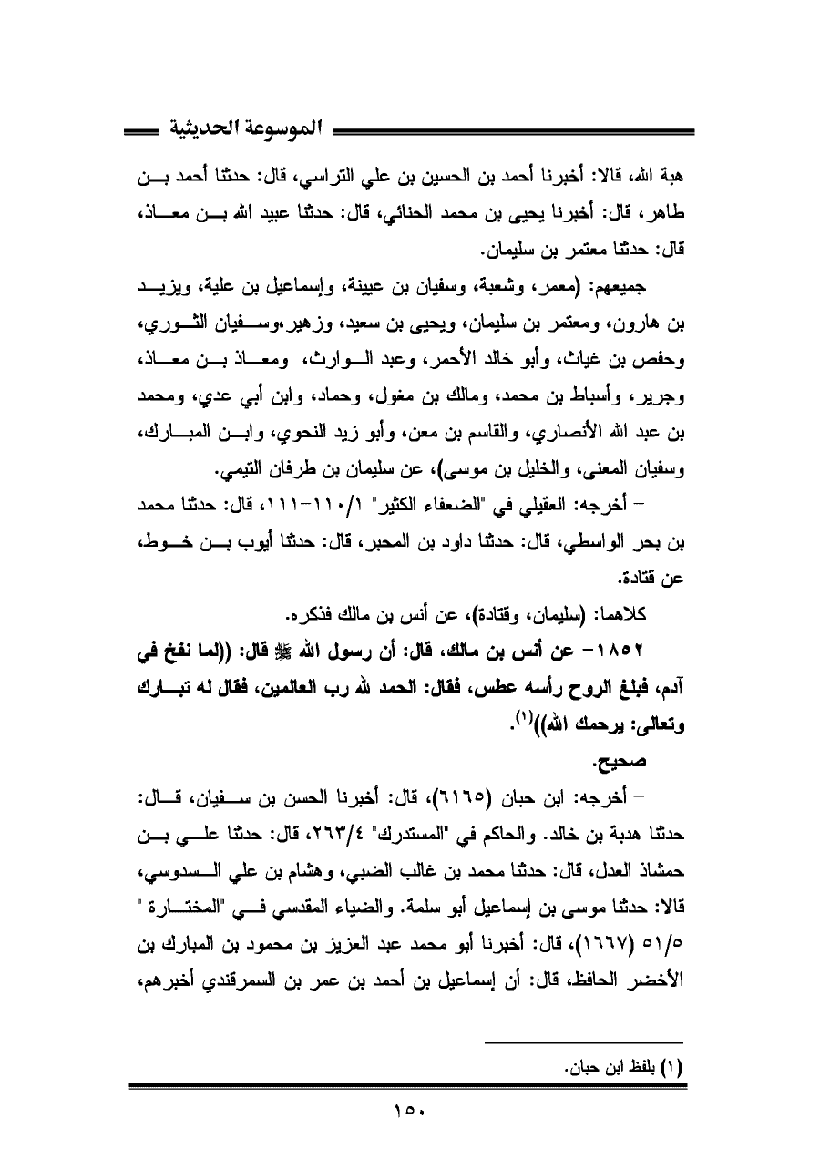١٨٥٢ - عن أنس بن مالك، قال: أن رسول اللّه - صلى الله عليه وسلم - قال: "لما نفخ في آدم، فبلغ الروح رأسه عطس، فقال: الحمد لله رب العالمين، فقال له تبارك وتعالى: يرحمك اللّه" (¬١).