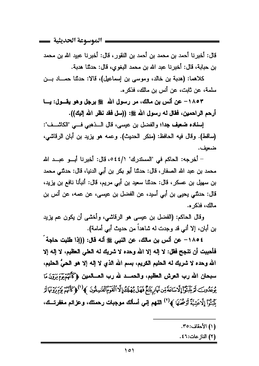 ١٨٥٤ - عن أنس بن مالك، عن النبي - صلى الله عليه وسلم - أنه قال: "إذا طلبت حاجةً فأحببت أن تنجح فقل: لا إله إلا اللّه وحده لا شريك له العلي العظيم، لا إله إلا الله وحده لا شريك له الحليم الكريم، بسم اللّه الذي لا إله إلا هو الحيُّ الحليم، سبحان اللّه رب العرش العظيم، والحمد للّه رب العالمين {كَأَنَّهُمْ يَوْمَ يَرَوْنَ مَا يُوعَدُونَ لَمْ يَلْبَثُوا إِلَّا سَاعَةً مِنْ نَهَارٍ بَلَاغٌ فَهَلْ يُهْلَكُ إِلَّا الْقَوْمُ الْفَاسِقُونَ} (¬١) {كَأَنَّهُمْ يَوْمَ يَرَوْنَهَا لَمْ يَلْبَثُوا إِلَّا عَشِيَّةً أَوْ ضُحَاهَا} (¬٢) اللهم إنى أسألك موجبات رحمتك، وعزائم مغفرتك،