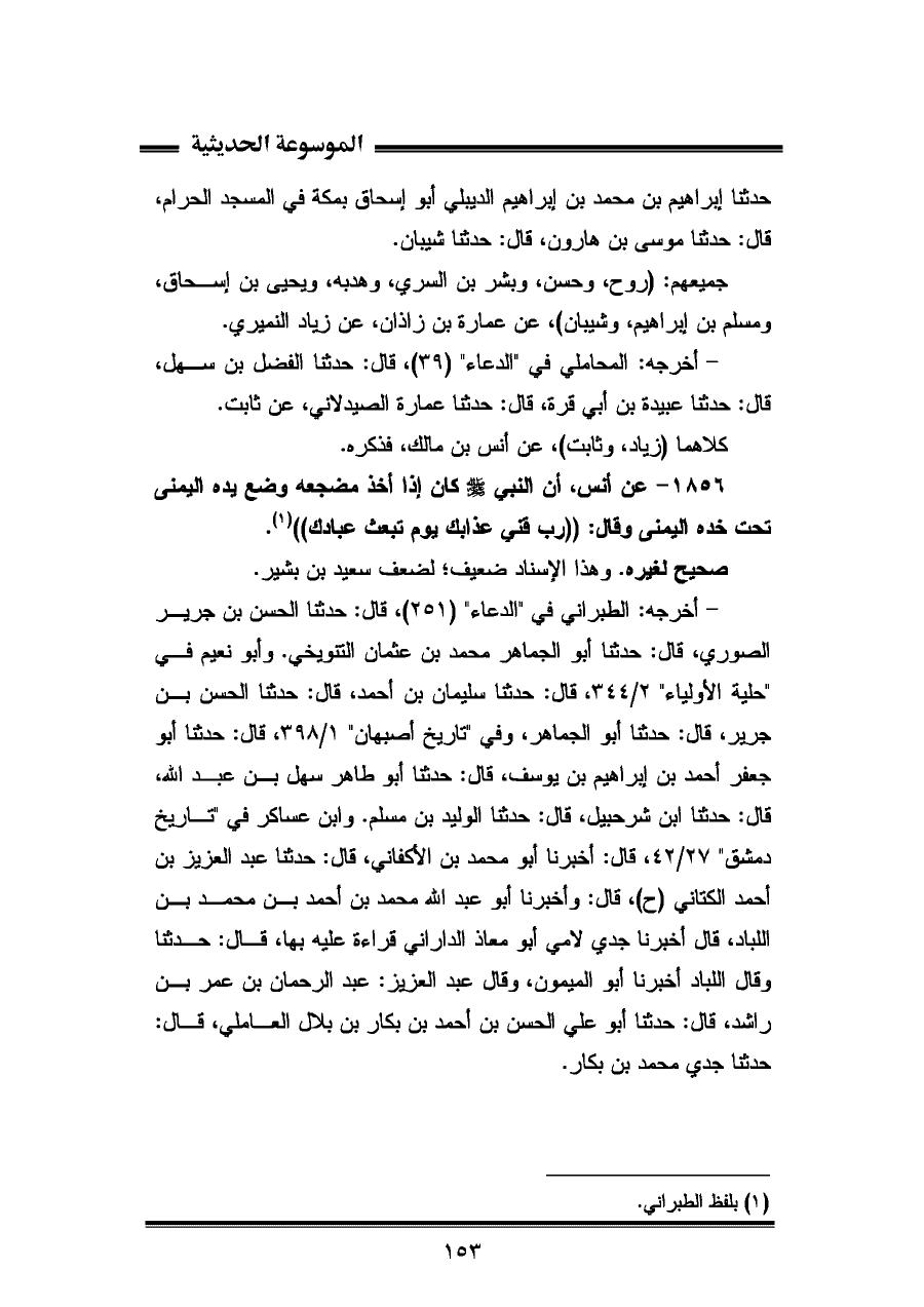 ١٨٥٦ - عن أنس، أن النبي - صلى الله عليه وسلم - كان إذا أخذ مضجعه وضع يده اليمنى تحت خده اليمنى وقال: "رب قني عذابك يوم تبعث عبادك" (¬١).