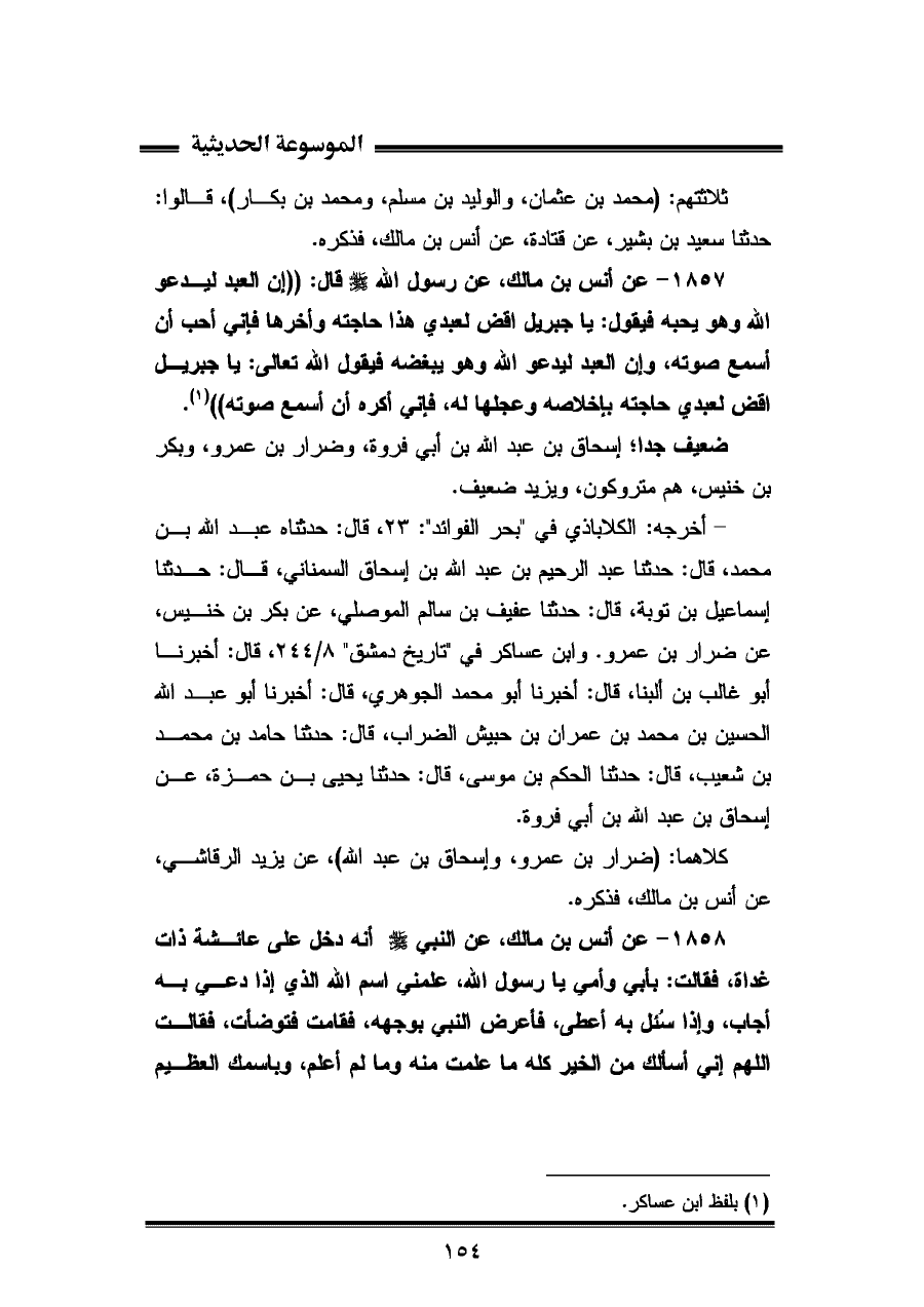 كلاهما: (ضرار بن عمرو، وإسحاق بن عبد الله)، عن يزيد الرقاشي، عن أنس بن مالك، فذكره.
