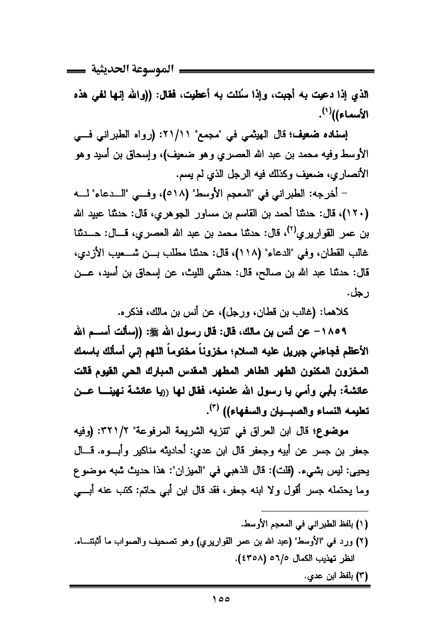 ١٨٥٩ - عن أنس بن مالك، قال: قال رسول اللّه - صلى الله عليه وسلم -: "سألت اسم الله الأعظم فجاءني جبريل عليه السلام؛ مخزونًا مختومًا اللهم إنى أسألك باسمك المخزون المكنون الطهر الطاهر المطهر المقدس المبارك الحى القيوم قالت عائشة: بأبى وأَمى يا رسول اللّه علمنيه، فقال لها "يا عائشة نهينا عن تعليمه النساء والصبيان والسفهاء" (¬٣).
