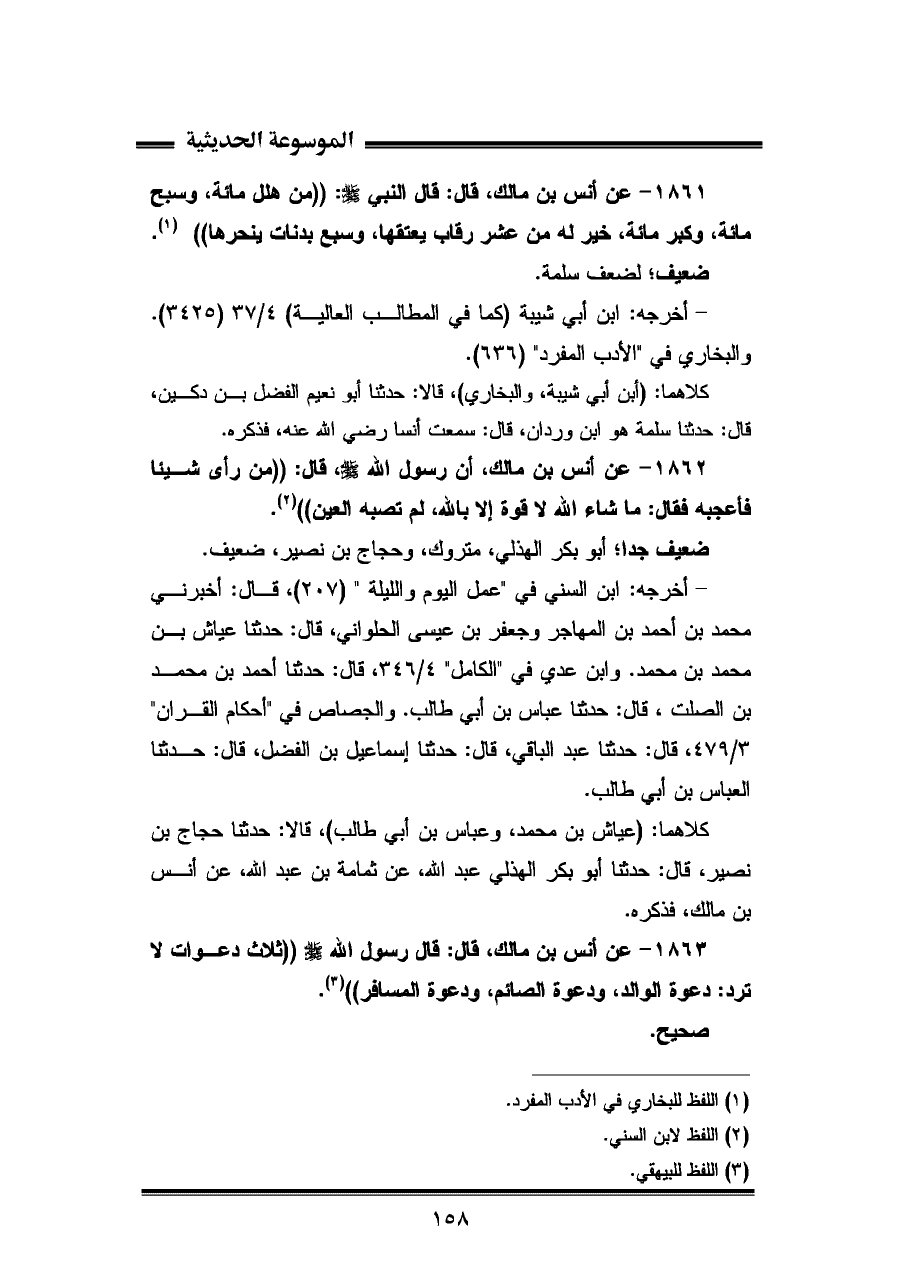١٨٦١ - عن أنس بن مالك، قال: قال النبي - صلى الله عليه وسلم -: "من هلل مائة، وسبع مائة، وكبر مائة، خير له من عشر رقاب يعتقها، وسبع بدنات ينحرها" (¬١).
