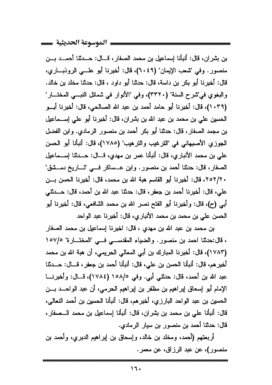 بن بشران، قال: أنبأنا إسماعيل بن محمد الصفار، قال: حدثنا أحمد بن منصور. وفي "شعب الإيمان" (٦٠٤٩)، قال: أخبرنا أبو على الروذباري، قال: أخبرنا أبو بكر بن داسة، قال: حدثنا أبو داود، قال: حدثنا مخلد بن خالد. والبغوي في "شرح السنة" (٣٣٢٠)، وفي "الأنوار في شمائل النبي المختار" (١٠٣٩)، قال: أخبرنا أبو حامد أحمد بن عبد الله الصالحي، قال: أخبرنا أبو الحسين علي بن محمد بن عبد الله بن بشران، قال: أخبرنا أبو علي إسماعيل بن محمد الصفار، قال: حدثنا أبو بكر أحمد بن منصور الرمادي. وابن الفضل الجوزي الأصبهاني في "الترغيب والترهيب" (١٧٨٥)، قال: أنبأنا أبو الحسن علي بن محمد الأنباري، قال: أنبأنا عمر بن مهدي، قال: حدثنا إسماعيل الصفار، قال: حدثنا أحمد بن منصور. وابن عساكر في "تاريخ دمشق" ٢٠/ ٢٥٢، قال: أخبرنا أبو القاسم هبة الله بن محمد، قال: أخبرنا الحسن بن على، قال: أخبرنا أحمد بن جعفر، قال: حدثنا عبد الله بن أحمد، قال: حدثني أبي (ح)، قال: وأخبرنا أبو الفتح نصر الله بن محمد الشافعي، قال: أخبرنا أبو الحسن علي بن محمد بن محمد الأنباري، قال: أخبرنا عبد الواحد بن محمد بن عبد الله بن مهدي، قال: أخبرنا إسماعيل بن محمد الصفار، قال: حدثنا أحمد بن منصور. والضياء المقدسي في "المختارة" ٥/ ١٥٧ (١٧٨٣)، قال: أخبرنا المبارك بن أبي المعالي الحريمي، أن هبة الله بن محمد أخبرهم، قال: أنبأنا الحسن بن علي، قال: أنبأنا أحمد بن جعفر، قال: حدثنا عبد الله بن أحمد، قال: حدثني أبي. وفي ٥/ ١٥٨ (١٧٨٤)، قال: وأخبرنا الإمام أبو إسحاق إبراهيم بن مظفر بن إبراهيم الحرمي، أن عبد الواحد بن الحسين بن عبد الواحد البارزى، أخبرهم، قال: أنبأنا الحسين بن أحمد النعالى، قال: أنبأنا علي بن محمد بن بشران، قال: أنبأنا إسماعيل بن محمد الصفار، قال: حدثنا أحمد بن منصور بن سيار الرمادي.