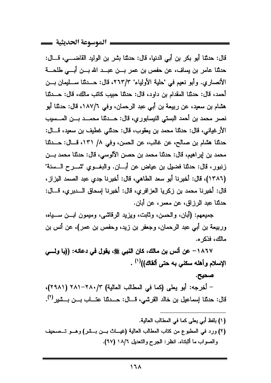 ١٨٦٧ - عن أنس بن مالك، كان النبي - صلى الله عليه وسلم -، يقول في دعائه: "يا ولى الإسلام وأهله سكني به حتى ألقاك" (¬١).