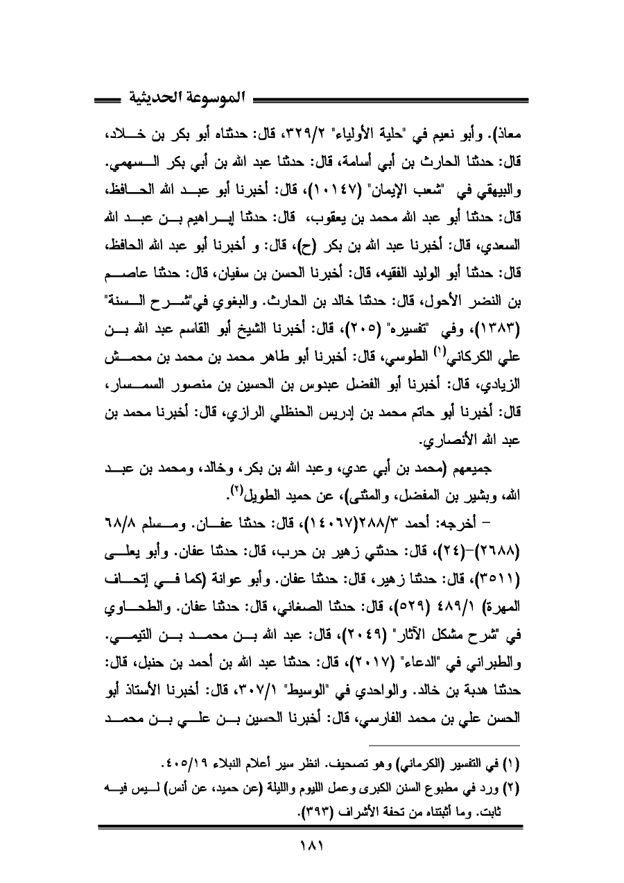 معاذ). وأبو نعيم في "حلية الأولياء" ٢/ ٣٢٩، قال: حدثناه أبو بكر بن خلاد، قال: حدثنا الحارث بن أبي أسامة، قال: حدثنا عبد الله بن أبي بكر السهمي. والبيهقي في "شعب الإيمان" (١٠١٤٧)، قال: أخبرنا أبو عبد الله الحافظ، قال: حدثنا أبو عبد الله محمد بن يعقوب، قال: حدثنا إبراهيم بن عبد الله السعدي، قال: أخبرنا عبد الله بن بكر (ح)، قال: وأخبرنا أبو عبد الله الحافظ، قال: حدثنا أبو الوليد الفقيه، قال: أخبرنا الحسن بن سفيان، قال: حدثنا عاصم بن النضر الأحول، قال: حدثنا خالد بن الحارث. والبغوي في "شرح السنة" (١٣٨٣)، وفي "تفسيره" (٢٠٥)، قال: أخبرنا الشيخ أبو القاسم عبد الله بن علي الكركاني (¬١) الطوسي، قال: أخبرنا أبو طاهر محمد بن محمد بن محمش الزيادي، قال: أخبرنا أبو الفضل عبدوس بن الحسين بن منصور السمسار، قال: أخبرنا أبو حاتم محمد بن إدريس الحنظلي الرازي، قال: أخبرنا محمد بن عبد الله الأنصاري.