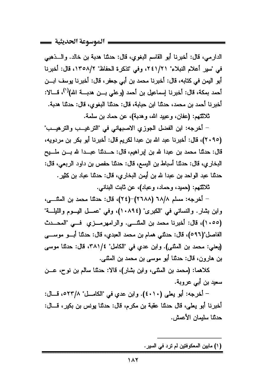 الدارمي، قال: أخبرنا أبو القاسم البغوي، قال: حدثنا هدبة بن خالد. والذهبي في "سير أعلام النبلاء" ٢١/ ٢٤١، وفي "تذكرة الحفاظ" ٢/ ١٣٥٨، قال: أخبرنا أبو اليمن في كتابه، قال: أخبرنا محمد بن أبي جعفر، قال: أخبرنا يوسف بن أحمد بمكة، قال: أخبرنا إسماعيل بن أحمد (وعلي بن هدبة الله) (¬١)، قالا: أخبرنا أحمد بن محمد، حدثنا ابن حبابة، قال: حدثنا البغوي، قال: حدثنا هدبة.