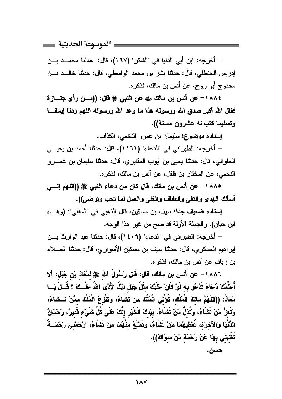 ١٨٨٦ - عن أنس بن مالك، قَالَ: قَالَ رَسُولُ اللّهِ - صلى الله عليه وسلم - لِمُعَاذِ بْنِ جَبلٍ: ألا أعلِّمُكَ دُعَاءً تدْعُو بِه لَوْ كَانَ علَيكَ مِثلُ جَبلٍ دَينًا لأدَّى الله عَنكَ؟ قُلْ يَا مُعَاذُ: "اللَّهُمَّ مَالِكُ الْمُلك، تُؤْتِي الْمُلكَ مَنْ تَشَاءُ، وتَنْزِعُ الْمُلكَ مِمّنْ تَشَاءُ، وتُعِزُّ مَنْ تَشَاءُ، وتُذِلُّ مَنْ تَشَاءُ، بِيَدِكَ الْخَيْرِ إِنَّكَ عَلَى كُلِّ شَىْءٍ قَدِيرٌ، رَحْمَانُ الدُّنيَا وَالآخِرَةِ، تُعطيهُمَا مَنْ تَشَاءُ، وَتَمنَعُ مِنْهُمَا مَنْ تَشَاءُ، ارْحَمني رَحْمَةً تُغْنِينِى بِهَا عن رَحْمَةِ مَنْ سِوَاكَ".