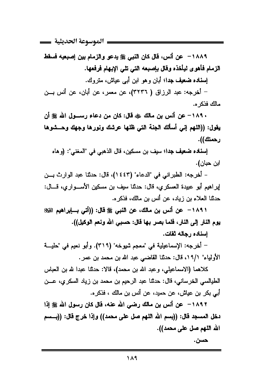 ١٨٩٢ - عن أنس بن مالك رضي الله عنه، قال كان رسول الله - صلى الله عليه وسلم - إذا دخل المسجد قال: "بسم اللّه اللهم صل على محمد" وإذا خرج قال: "بسم اللّه اللهم صل على محمد".