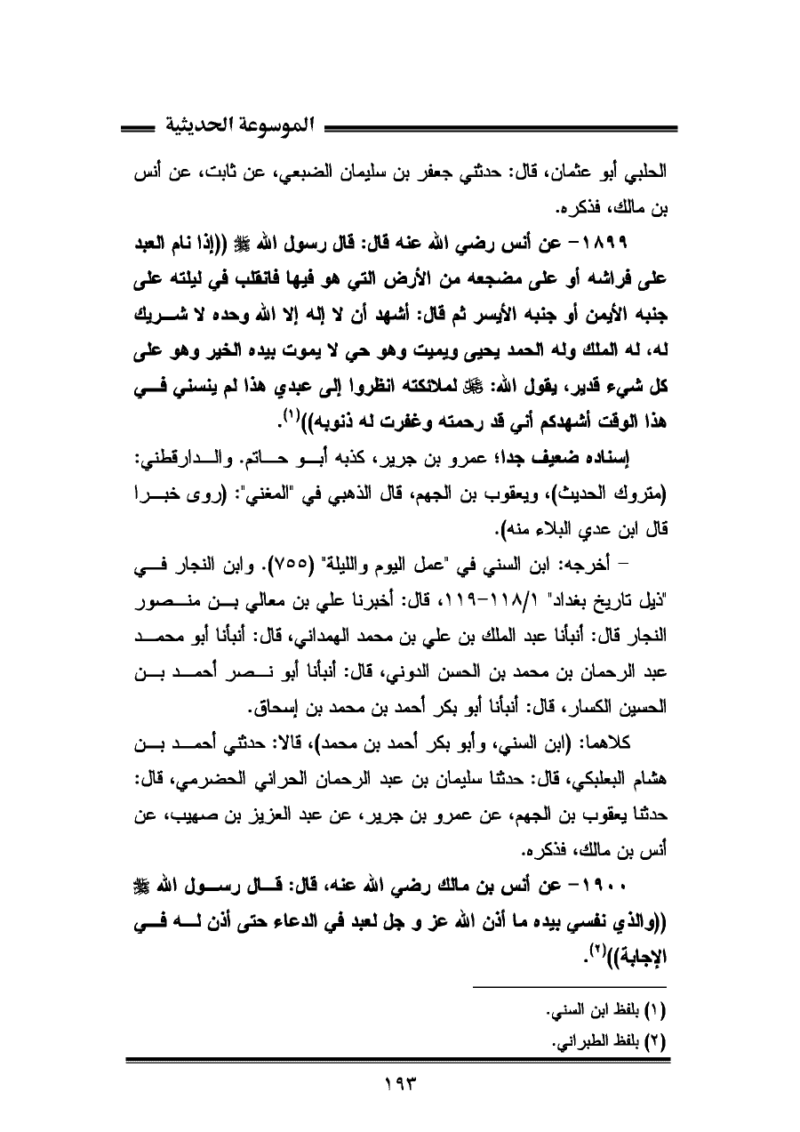 ١٨٩٩ - عن أنس رضى اللّه عنه قال: قال رسول اللّه - صلى الله عليه وسلم - "إذا نام العبد على فراشه أو على مضجعه من الأرض التي هو فيها فانقلب في ليلته على جنبه الأيمن أو جنبه الأيسر ثم قال: أشهد أن لا إله إلا اللّه وحده لا شريك له، له الملك وله الحمد يحيى ويميت وهو حى لا يموت بيده الخير وهو على كل شئ قدير، يقول الله: - عز وجل - لملائكته انظروا إلى عبدي هذا لم ينسني في هذا الوقت أشهدكم أني قد رحمته وغفرت له ذنوبه" (¬١).