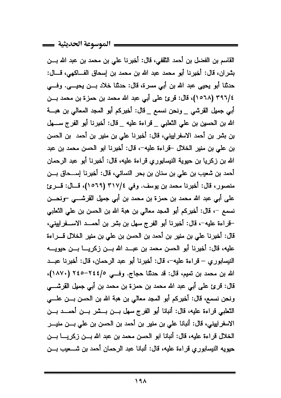 القاسم بن الفضل بن أحمد الثقفي، قال: أخبرنا علي بن محمد بن عبد الله بن بشران، قال: أخبرنا أبو محمد عبد الله بن محمد بن إسحاق الفاكهي، قال: حدثنا أبو يحيى عبد الله بن أبي مسرة، قال: حدثنا خلاد بن يحيى. وفي ٤/ ٣٩٦ (١٥٦٨)، قال: قرئ على أبي عبد الله محمد بن حمزة بن محمد بن أبي جميل القرشي - ونحن نسمع - قال: أخبركم أبو المجد المعالي بن هبة الله بن الحسين بن علي الثعلبي - قراءة عليه - قال: أخبرنا أبو الفرج سهل بن بشر بن أحمد الاسفرايينى، قال: أخبرنا علي بن منير بن أحمد بن الحسن بن علي بن منير الخلال - قراءة عليه -، قال: أخبرنا أبو الحسن محمد بن عبد الله بن زكريا بن حيوية النيسابوري قراءة عليه، قال: أخبرنا أبو عبد الرحمان أحمد بن شعيب بن علي بن سنان بن بحر النسائي، قال: أخبرنا إسحاق بن منصور، قال: أخبرنا محمد بن يوسف. وفي ٤/ ٣١٧ (١٥٦٩)، قال: قرئ على أبي عبد الله محمد بن حمزة بن محمد بن أبي جميل القرشي - ونحن نسمع -، قال: أخبركم أبو المجد معالي بن هبة الله بن الحسن بن علي الثعلبي - قراءة عليه -، قال: أخبرنا أبو الفرج سهل بن بشر بن أحمد الاسفراييني، قال: أخبرنا علي بن منير بن أحمد بن الحسن بن علي بن منير الخلال قراءة عليه، قال: أخبرنا أبو الحسن محمد بن عبد الله بن زكريا بن حيويه النيسابوري - قراءة عليه -، قال: أخبرنا أبو عبد الرحمان، قال: أخبرنا عبد الله بن محمد بن تميم، قال: قد حدثنا حجاج. وفي ٥/ ٢٤٤ - ٢٤٥ (١٨٧٠)، قال: قرئ على أبي عبد الله محمد بن حمزة بن محمد بن أبي جميل القرشي ونحن نسمع، قال: أخبركم أبو المجد معالي بن هبة الله بن الحسن بن علي الثعلبي قراءة عليه، قال: أنبأنا أبو الفرج سهل بن بشر بن أحمد بن الاسفرايينى، قال: أنبأنا علي بن منير بن أحمد بن الحسن بن علي بن منير الخلال قراءة عليه، قال: أنبأنا أبو الحسن محمد بن عبد الله بن زكريا بن حيويه النيسابوري قراءة عليه، قال: أنبأنا عبد الرحمان أحمد بن شعيب بن