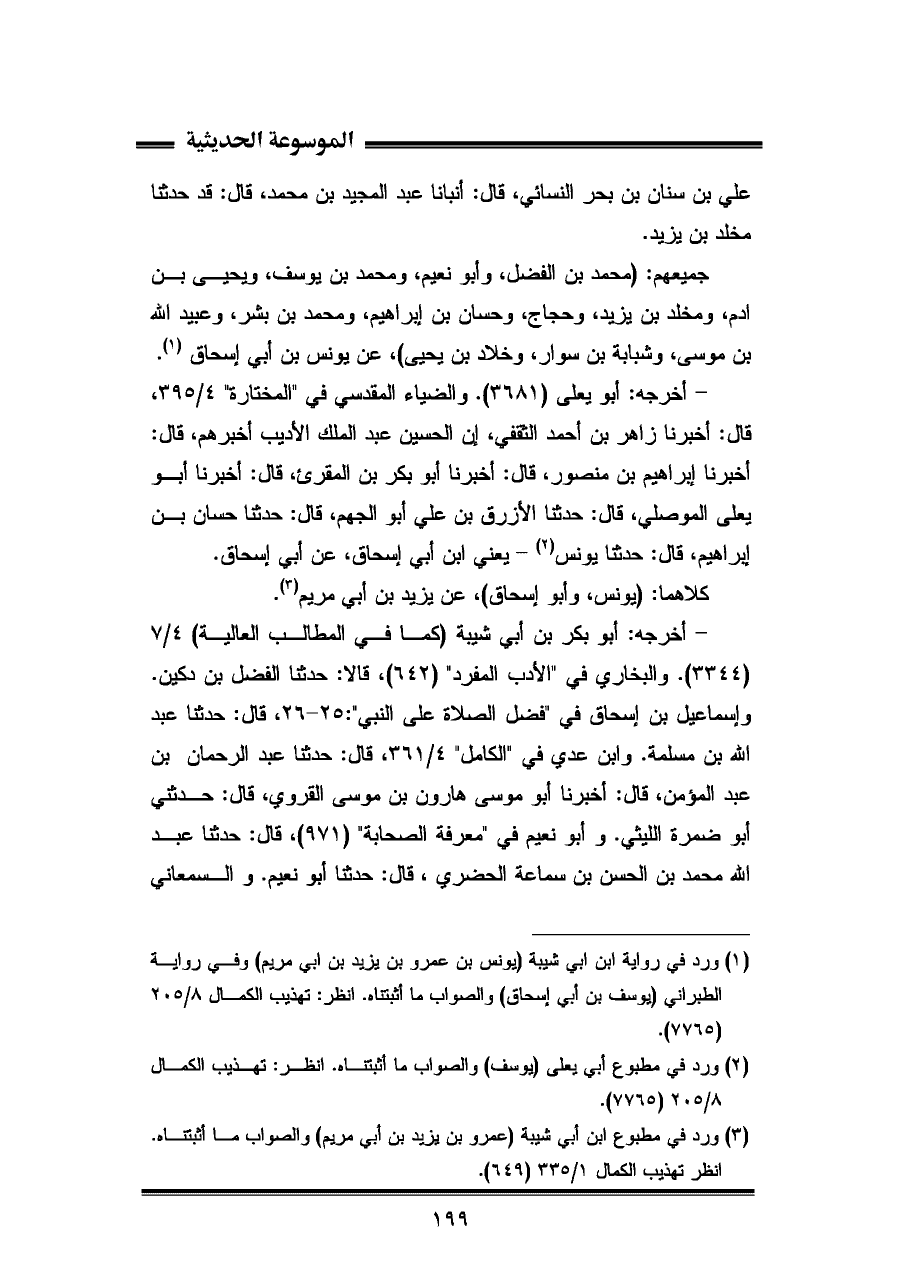 (¬١) ورد في رواية ابن أبي شيبة (يونس بن عمرو بن يزيد بن أبي مريم) وفي رواية الطبراني (يوسف بن أبي إسحاق) والصواب ما أثبتناه. انظر: تهذيب الكمال ٨/ ٢٠٥ (٧٧٦٥).