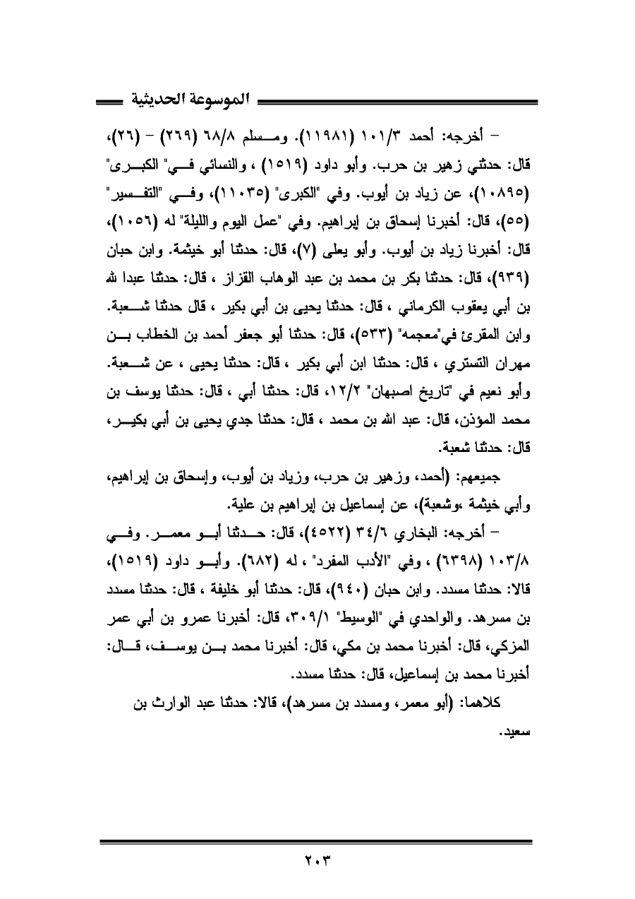 جميعهم: (أحمد، وزهير بن حرب، وزياد بن أيوب، وإسحاق بن إبراهيم، وأبي خيثمة، وشعبة)، عن إسماعيل بن إبراهيم بن علية.