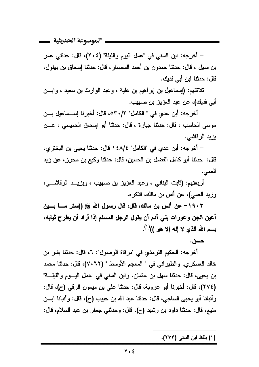 ١٩٠٣ - عن أنس بن مالك، قال: قال رسول اللّه - صلى الله عليه وسلم - "ستر ما بين أعين الجن وعورات بنى آدم أن يقول الرجل المسلم إذا أراد أن يطرح ثيابه، بسم اللّه الذي لا إله إلا هو " (¬١).