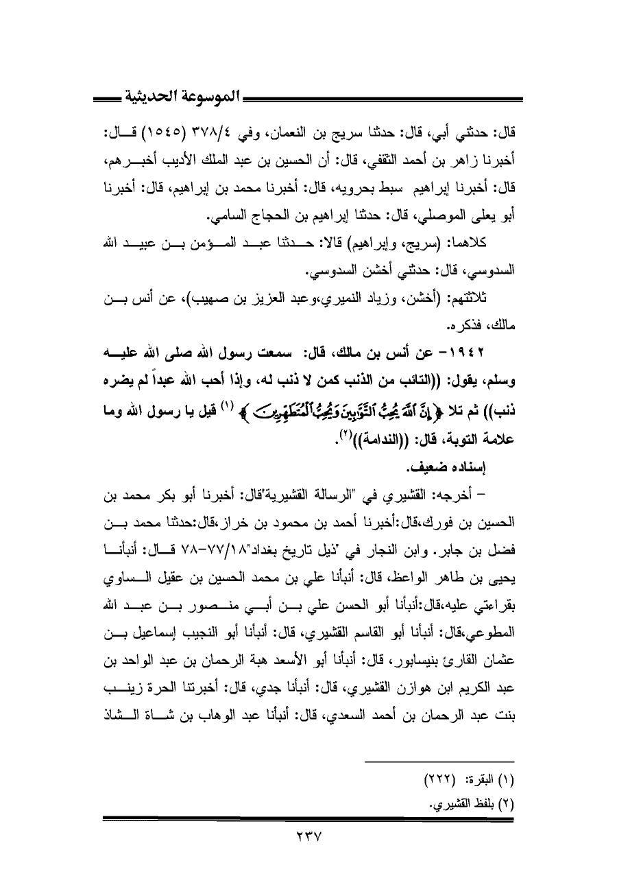 ١٩٤٢ - عن أنس بن مالك، قال: سمعت رسول اللّه صلى اللّه عليه وسلم، يقول: "التائب من الذنب كمن لا ذنب له، وإذا أحب اللّه عبدًا لم يضره ذنب" ثم تلا {إِنَّ اللَّهَ يُحِبُّ التَّوَّابِينَ وَيُحِبُّ الْمُتَطَهِّرِينَ} (¬١) قيل يا رسول اللّه وما علامة التوبة، قال: "الندامة" (¬٢).