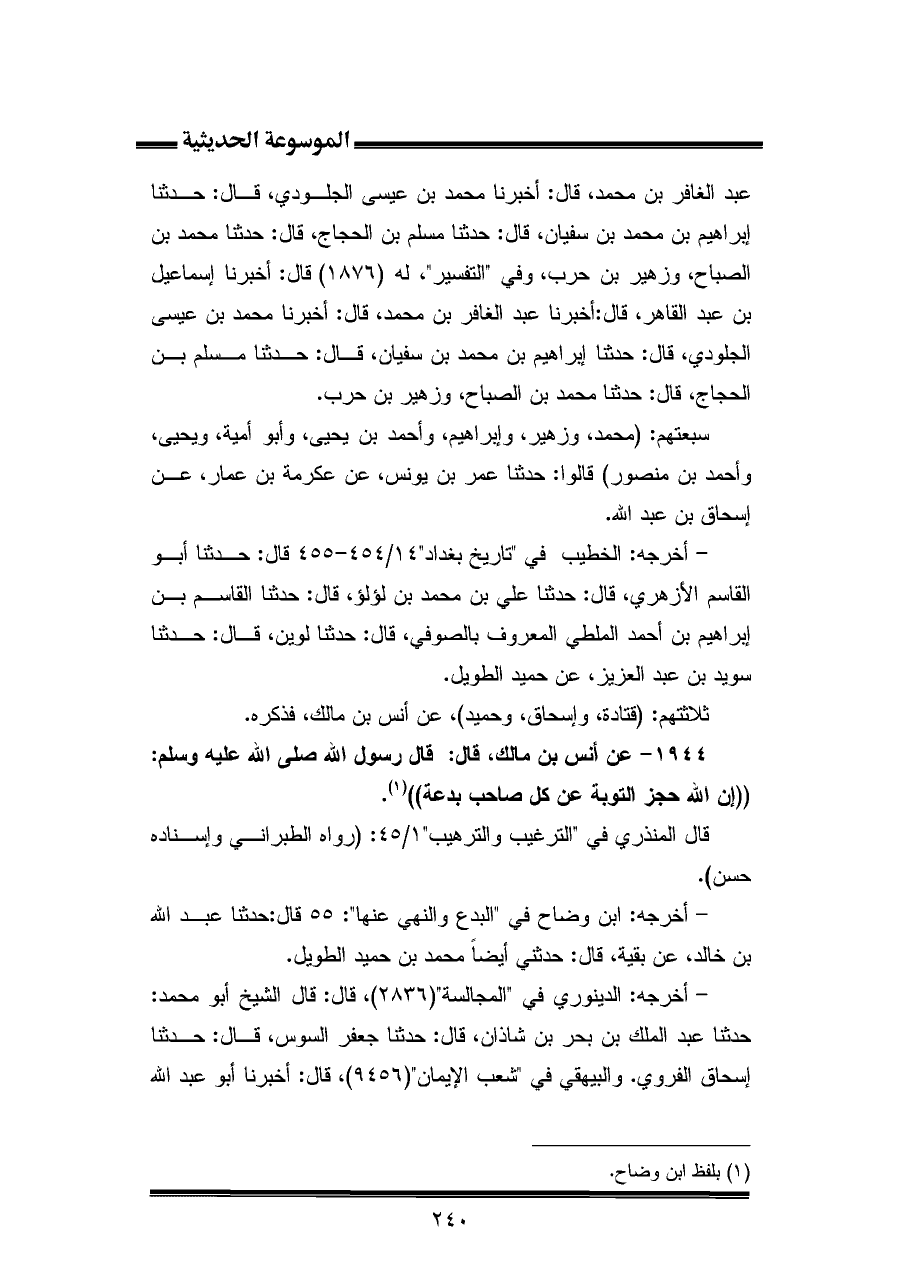 ١٩٤٤ - عن أنس بن مالك، قال: قال رسول الله صلى الله عليه وسلم: ((إن الله حجز التوبة عن كل صاحب بدعة)) (¬١).