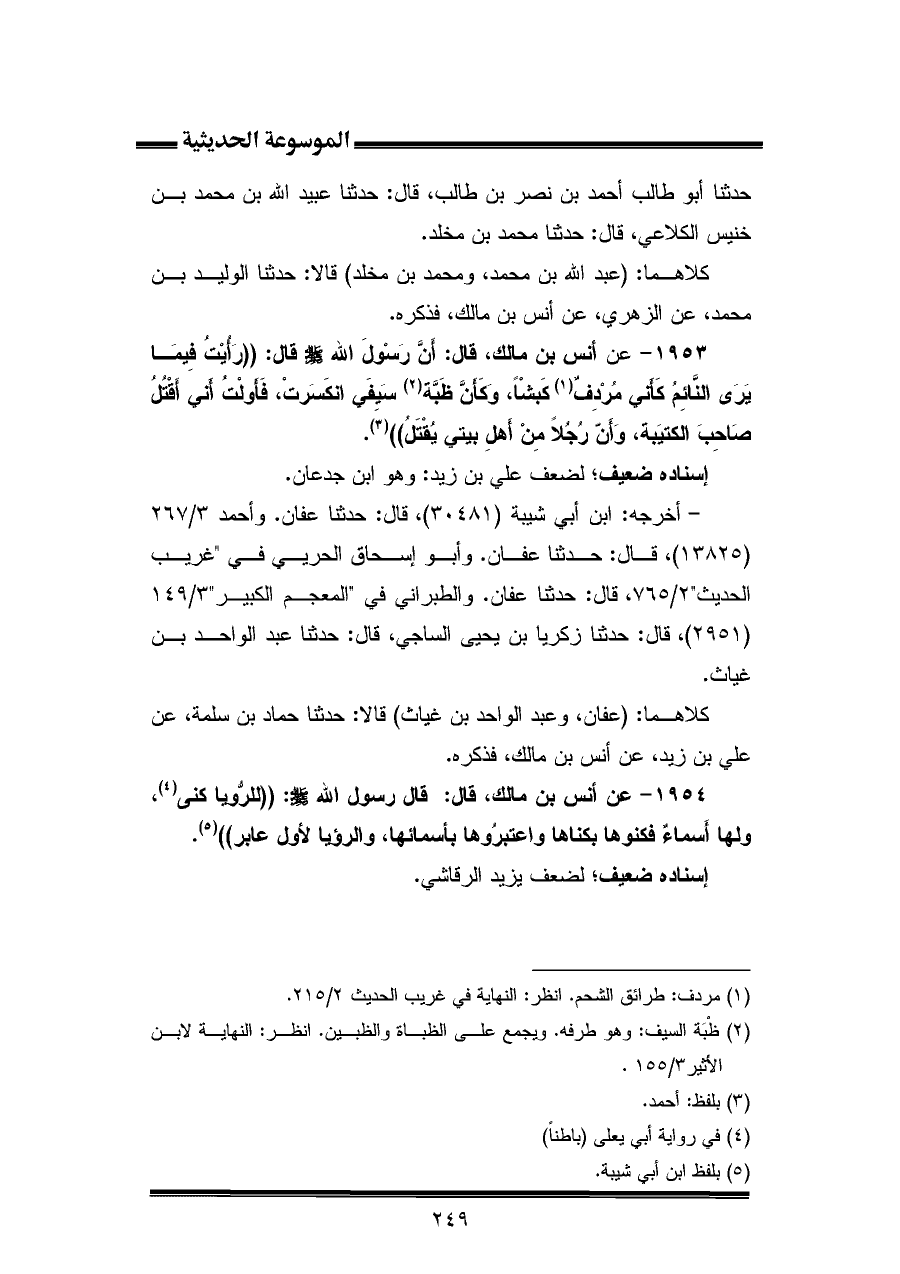 ١٩٥٤ - عن أنس بن مالك، قال: قال رسول الله: - صلى الله عليه وسلم - ((للرُّويا كنى (¬٤)، ولها أسماءٌ فكنوها بكناها واعتبرُوها بأسمائها، والرؤيا لأول عابر)) (¬٥).