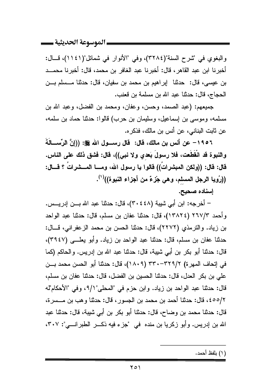 ١٩٥٦ - عن أنس بن مالك، قال: قال رسول الله - صلى الله عليه وسلم - (إنَّ الرِّسالَةَ والنبوة قد انْقَطَعت، فلا رسولَ بَعدِي ولا نبي))، قال: فشق ذلك على الناس. قال: قال: ((ولكن المبشراتُ)) قالوا يا رسول الله، وما المشراتُ؟ قال: ((رُويا الرجل المسِلِم، وهي جْزغ من أجزاء النبوة)) (¬١).