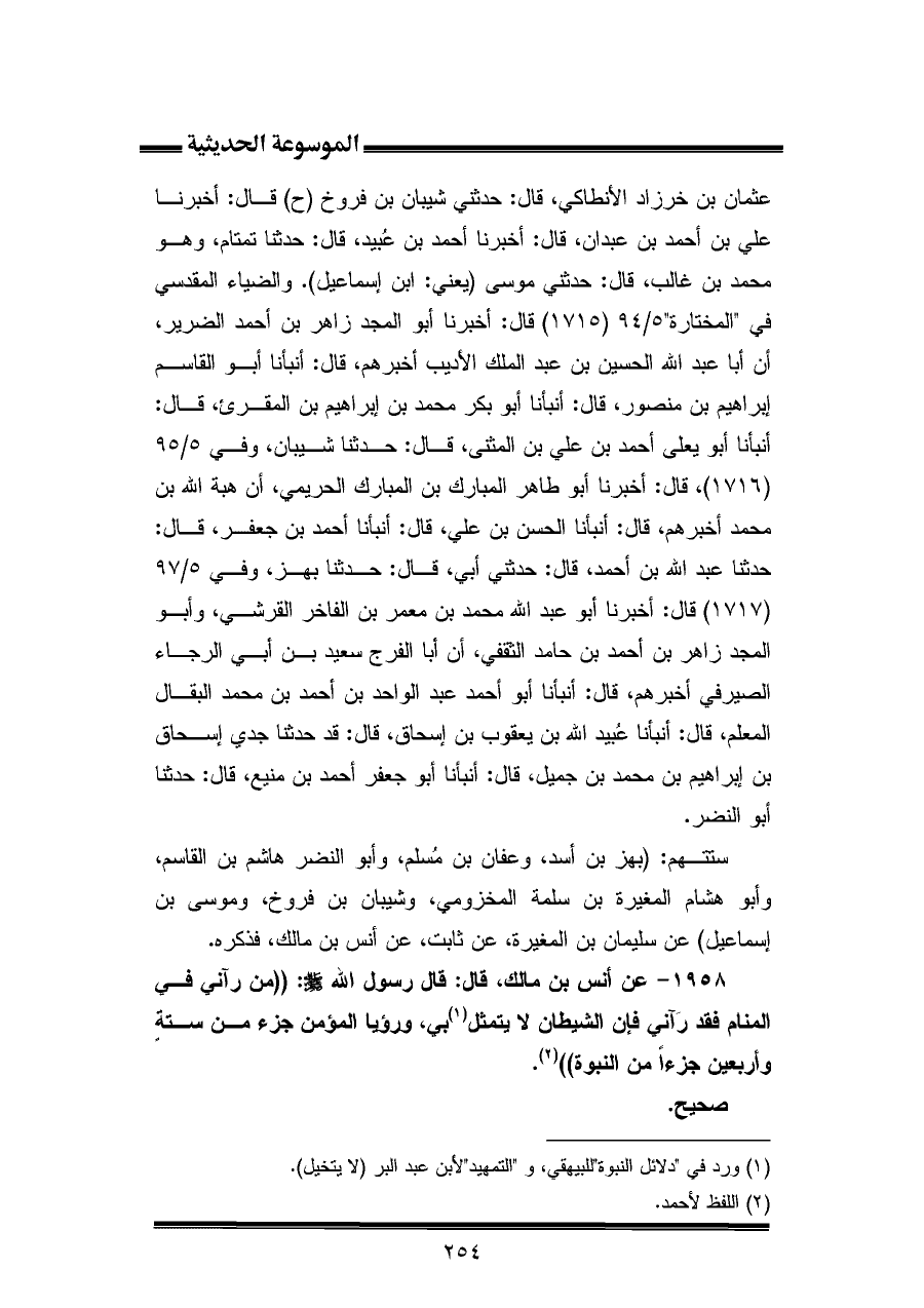 ١٩٥٨ - عن أنس بن مالك، قال: قال رسول الله - صلى الله عليه وسلم - (من رآني في المنام فقد رَآني فإن الشيطان لا يتمثل (¬١) بي، ورؤيا المؤمن جزء من ستة وأربعين جزءًا من النبوة)) (¬٢).
