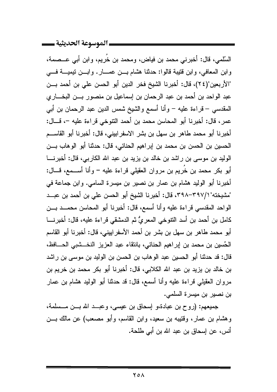 السُلمي، قال: أخبرني محمد بن فياض، ومحمد بن خُريم، وابن أبي عصمة، وابن المعافي، وابن قتيبة قالوا: حدثنا هشام بن عمار. وابن تيمية في "الأربعين " (٢٤)، قال: أخبرنا الشيخ فخر الدين أبو الحسن علي بن أحمد بن عبد الواحد بن أحمد بن عبد الرحمان بن إسماعيل بن منصور بن البخاري المقدسي- قراءة عليه- وأنا أسمع والشيخ شمس الدين عبد الرحمان بن أبي عمر، قال: أخبرنا أبو المحاسن محمد بن أحمد النتوخي قراءة عليه-، قال: أخبرنا أبو محمد طاهر بن سهل بن بشر الاسفرابيني، قال: أخبرنا أبو القاسم الحسين بن الحسن بن محمد بن إبراهيم الحنائي، قال: حدثنا أبو الوهاب بن الوليد بن موسى بن راشد بن خالد بن يزيد بن عبد الله الكاربي، قال: أخبرنا أبو بكر محمد بن خُريم بن مروان العقيلي قراءة عليه- وأنا أسمع، قال: أخبرنا أبو الوليد هشام بن عمار بن نصير بن ميسرة السامي. وابن جماعة في "مشيخته " ١/ ٣٩٧ - ٣٩٨، قال: أخبرنا الشيخ أبو الحسن علي بن أحمد بن عبد الواحد المقدسي قراءة عليه وأنا أسمع، قال: أخبرنا أبو المحاسن محمد بن كامل بن أحمد بن أسد التنوخي المعرفي ثم الدمشقي قراءة عليه، قال: أخبرنا أبو محمد طاهر بن سهل بن بشر بن أحمد الأسفراييني، قال: أخبرنا أبو القاسم الحُسين بن محمد بن إبراهيم الحنائي، بانتقاء عبد العزيز النخشبي الحافظ، قال: قد حدثنا أبو الحسين عبد الوهاب بن الحسن بن الوليد بن موسى بن راشد بن خالد بن يزيد بن عبد الله الكلابي، قال: أخبرنا أبو بكر محمد بن خريم بن مروان العقيلي قراءة عليه وأنا أسمع، قال: قد حدثنا أبو الوليد هشام بن عمار بن نصير بن ميسرة السلمي.