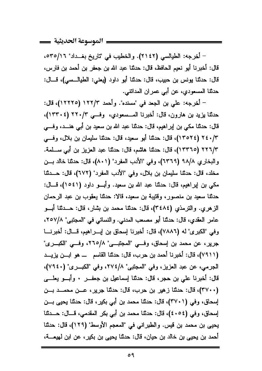 - أخرجه: الطيالسي (٢١٤٢). والخطيب في "تاريخ بغداد" ١٦/ ٥٣٥، قال: أخبرنا أبو نعيم الحافظ، قال: حدثنا عبد الله بن جعفر بن أحمد بن فارس، قال: حَدَّثَنَا يونس بن حبيب، قال: حَدَّثَنَا أبو داود (يعني: الطيالسي)، قال: حَدَّثَنَا المسعودي، عن أبي عمران المدائني.